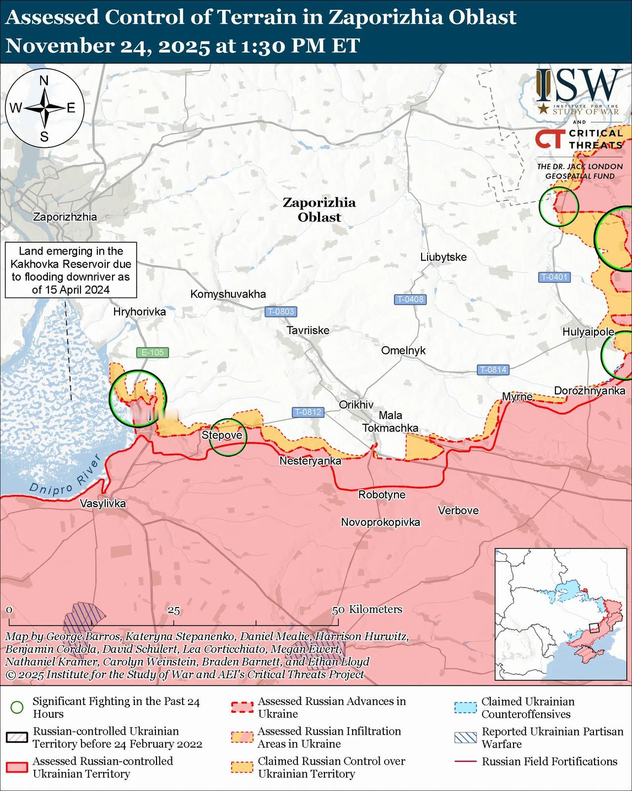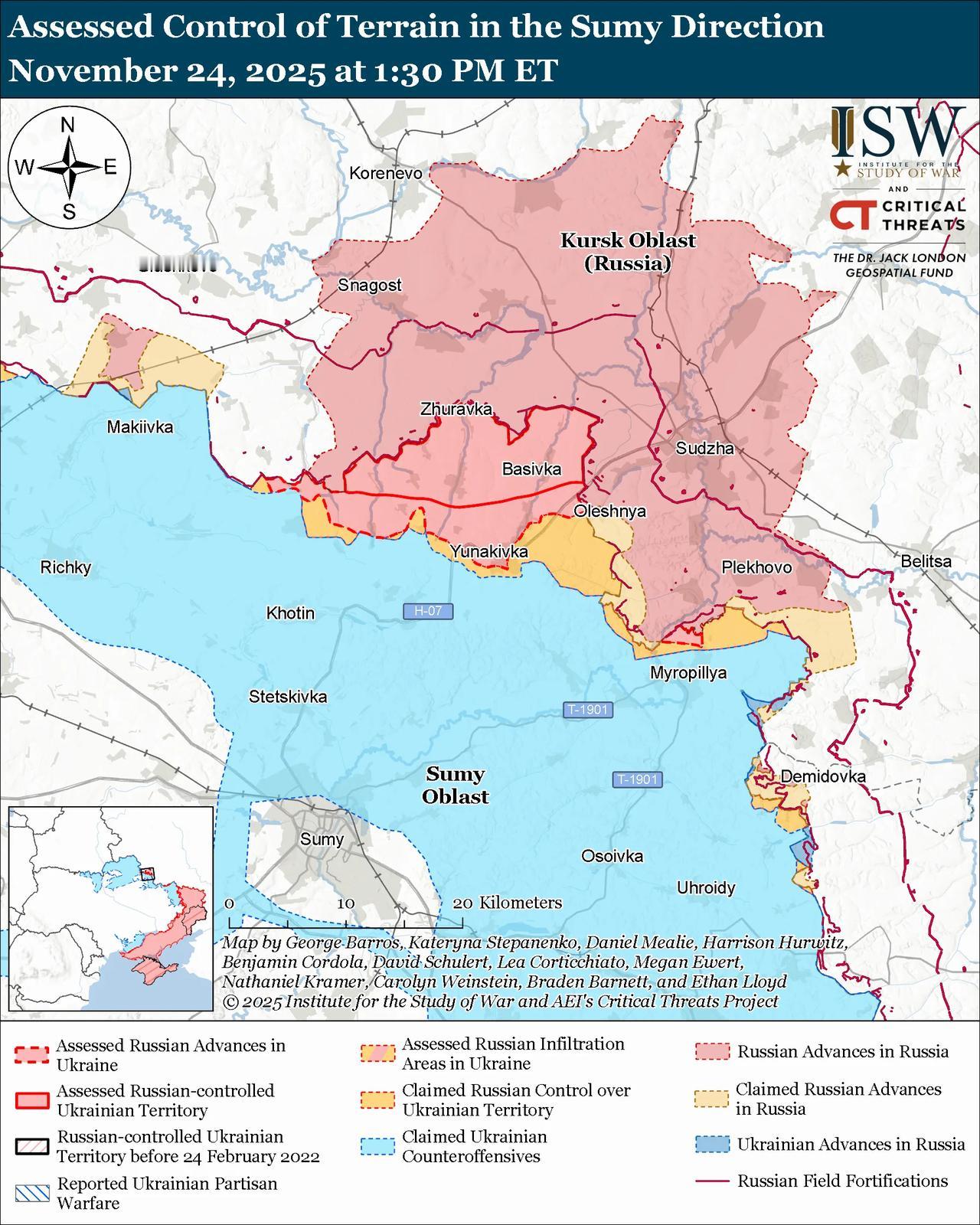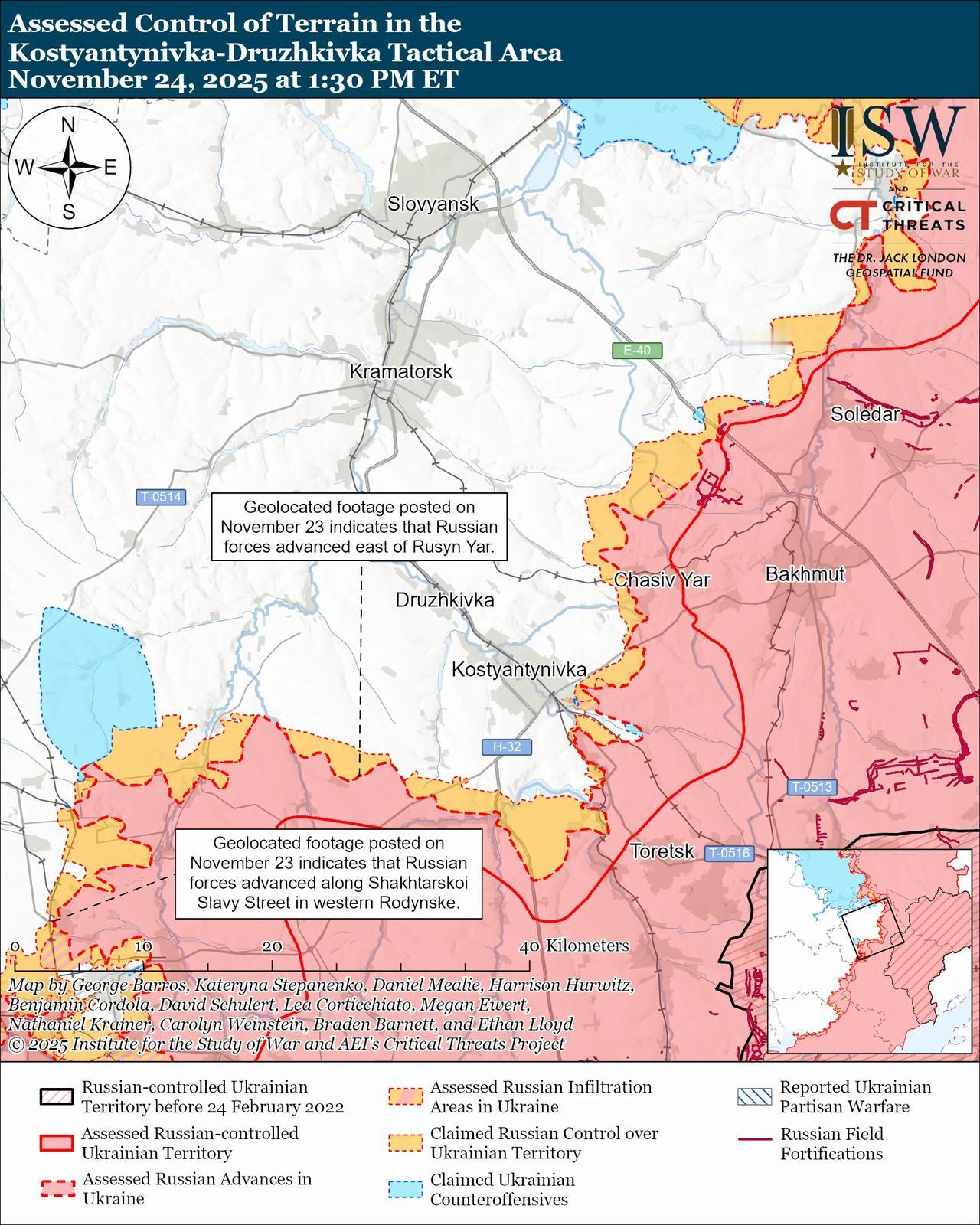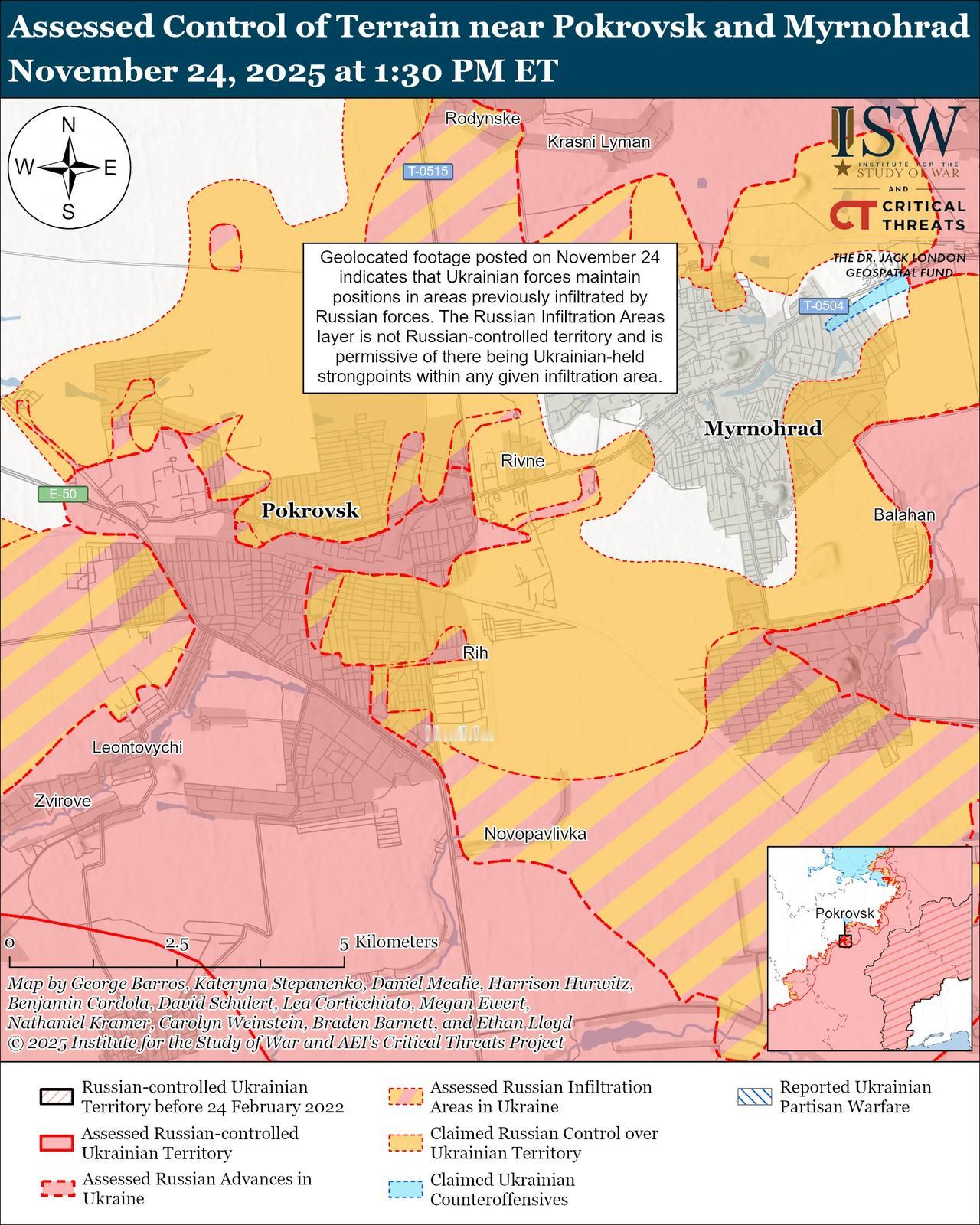 2025年11月24日俄乌前线战报 分战线军事行动总结 1. 乌克兰对俄本土行动 ・11 月 23~24 日夜间,乌克兰打击俄罗斯下诺夫哥罗德州克斯特沃能源设施(卢克石油炼油厂、石化厂),现场出现爆炸声;俄方称击落7架无人机,未确认设施受损情况 2. 北部战线(苏梅州,俄目标:建立边境缓冲带) ・俄军在苏梅市周边(博亚罗 - 列扎奇、金德拉季夫卡等地)发起进攻,无推进;俄军事博主称,俄军因路线遭乌军监控进攻失败,1427摩步团等部队长期未轮换,士气低落、纪律混乱(出现暴动) ・乌军在库尔斯克州泰特基诺仍有破坏侦察小组活动,并以 TOS-1A 温压炮反击俄军 3. 东部主战场(俄核心目标:夺顿涅茨克全州、卢甘斯克剩余地区) ・哈尔科夫州 俄军:沃昌斯克方向推进至市区墓地,火箭弹摧毁其北部城区;大布尔卢克方向夺取奥德拉内及周边 乌军应对:无人机拦截俄军后勤,在沃昌斯克西部组织防御,阻止俄军迂回 ・卢甘斯克州 俄军:库皮扬斯克、博罗瓦、斯洛维扬斯克 - 利曼方向小规模进攻,试图渗透乌军防线 乌军:开发雾天无人机侦察技术,维持阵地,组织平民撤离(库皮扬斯克余560人,博罗瓦余1000 人) ・顿涅茨克州 俄军行动:锡韦尔斯克夺取扎瓦尼夫卡;波克罗夫斯克空袭公寓楼(使用FAB-3000滑翔弹);新帕夫利夫卡、大迈哈伊洛夫卡推进至沃恰河沿岸 乌军应对:波克罗夫斯克反击清除部分街区的俄军;多布罗皮利亚一周内歼敌659、俘9人,毁8辆装甲车 4. 南部战线(俄目标:逼近扎波罗热市、维持前线) ・胡利亚波莱:俄军127摩步师夺取扎蒂什亚(胡利亚波莱以东2.6公里),渗透小组进入市区;乌军在周边(叶霍里夫卡、多布罗皮利亚等地)组织反击 ・扎波罗热西部:俄军在奥里霍夫周边(马拉托克马奇卡、新安德烈夫卡等地)进攻,无推进;俄博主称马拉托克马奇卡为 “灰色地带”,乌军否认俄军夺城 ・赫尔松方向:俄军在安东诺夫斯基大桥周边的进攻尚无进展;乌军无人机控制俄后勤线(奥列什基公路),俄车辆每5次运输仅能成功1次;俄方称将所有通行车辆视为合法目标(注意,这是违反国际法的,虽然战争条件下讲这没啥用[捂脸]) 5. 白俄罗斯与北约领空冲突 ・11月23~24日夜间,立陶宛监测到超40个白俄罗斯入侵气球,拉脱维亚监测到约30个;立陶宛维尔纽斯国际机场两度暂停运营 ・ISW判断:此举属俄罗斯 “零阶段”(信息与心理铺垫)行动,为潜在 “俄 - 北约战争” 做准备;白俄罗斯是俄事实上的共犯 6. 美乌和平计划推进与调整 ・美乌代表团将美方初始的28点和平计划缩减至19点,移除与乌克兰无关内容 ・关键共识:乌克兰加入北约遵循北约 “共识决策机制”;愿从当前战线讨论领土问题,拒绝俄方领土交换提议;而“冻结的1000亿美元俄罗斯资产将用于乌克兰重建”的条款已移除 ・后续流程:需特朗普与泽连斯基敲定领土、北约入盟条款;美方先与乌方确定最终计划,再协调欧洲伙伴,最后以 “胡萝卜加大棒” 策略说服俄方 7. 俄罗斯战场推进与顿涅茨克州态势 ・俄方推进速度仅为步行速度,ISW 评估夺取顿涅茨克州剩余地区需数年战役,将耗损俄大量人力物资 ・俄方短板:2022年至今未能夺取顿涅茨克州 “堡垒带”(此为乌军防御核心),2014年其以来多次尝试均告失败;当前战场依赖雾、雨天气降低乌军无人机威胁 8. 俄方对和平计划的态度 ・俄官方(克里姆林宫顾问乌沙科夫、国家杜马议员斯卢茨基)及极端民族主义者(军事博主)均拒绝美乌修订版计划,称 “欧洲版提议将延长战争”,试图甩锅欧洲 ・俄内部主张:部分议员称仅美俄为谈判相关方,应排除乌、欧意见;军事博主呼吁以武力实现战争目标,反对妥协 ・ISW判断:俄无意开展善意谈判,或通过拖延谈判争取战场推进时间,再以军事进展施压乌方投降 9. 关键战场攻防焦点补充 ・俄军近期推进区域:沃昌斯克、大布尔卢克、科斯蒂安蒂尼夫卡 - 德鲁日基夫卡战术区 俄空中、导弹与无人机行动 ・11 月 23~24 日夜间,俄发射 162 架无人机(含 80 架 “沙赫德” 无人机),它们从俄本土(库尔斯克、布良斯克等地)及克里米亚起飞打击乌克兰基础设施 ・乌军击落其中的125架,但仍有37架俄军无人机击中了15处目标;第聂伯罗彼得罗夫斯克州、哈尔科夫州超7万用户断电;哈尔科夫、切尔尼希夫等州港口、农业、能源设施受损;切尔尼希夫市下午遭袭致3名平民受伤,扎波罗热州一辆小巴遭FPV无人机打击,致1人死亡 评估与数据来源 ・ISW 仅评估俄战争罪对军事行动的影响 ・数据来源:仅使用公开信息(俄乌官方通报、社交媒体、商业卫星图像、西方媒体) 更多精彩内容,尽在