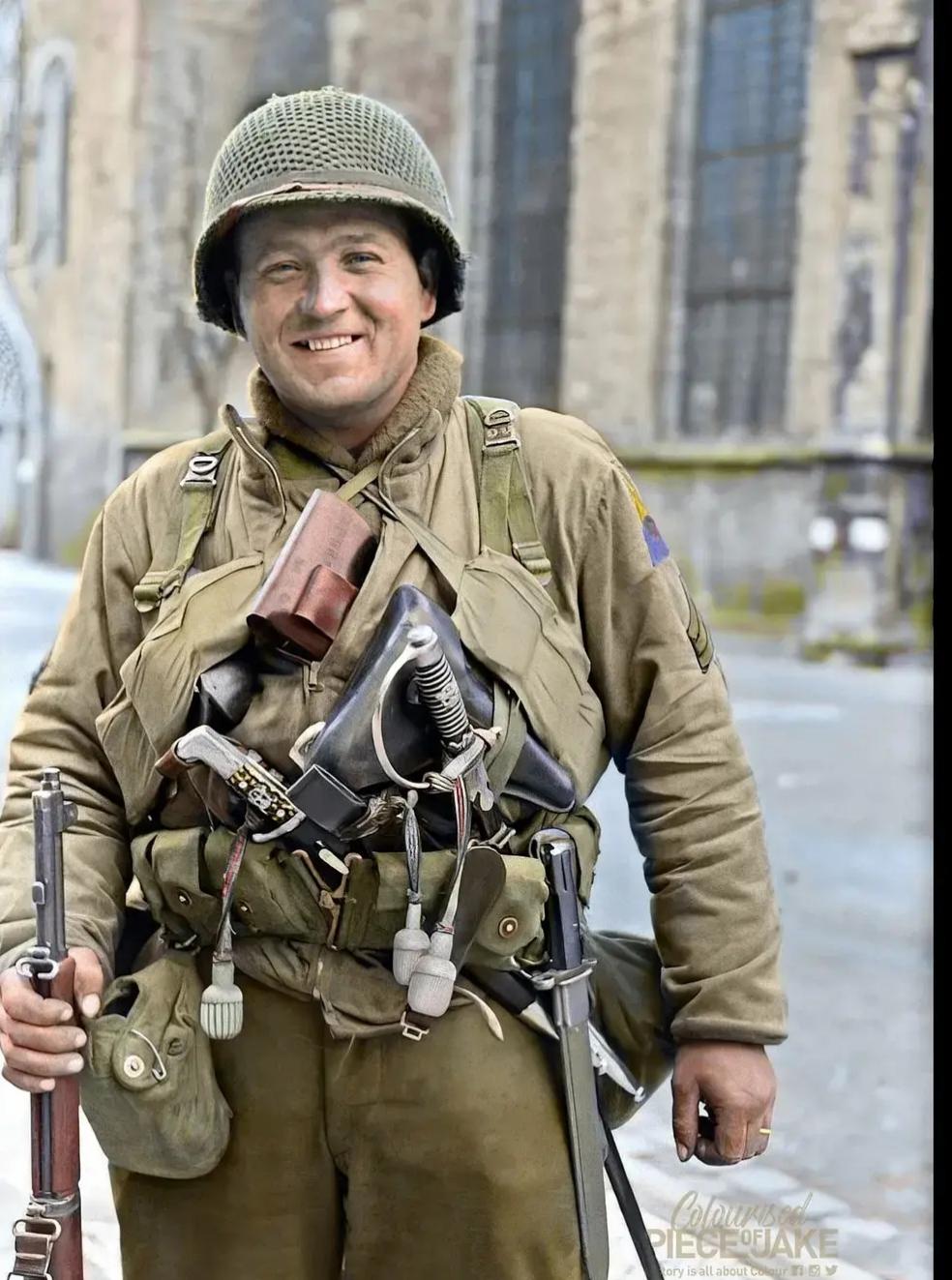 1945年4月,德国齐格菲防线附近的一座城市,第二装甲师的一名士兵手持一些战利品