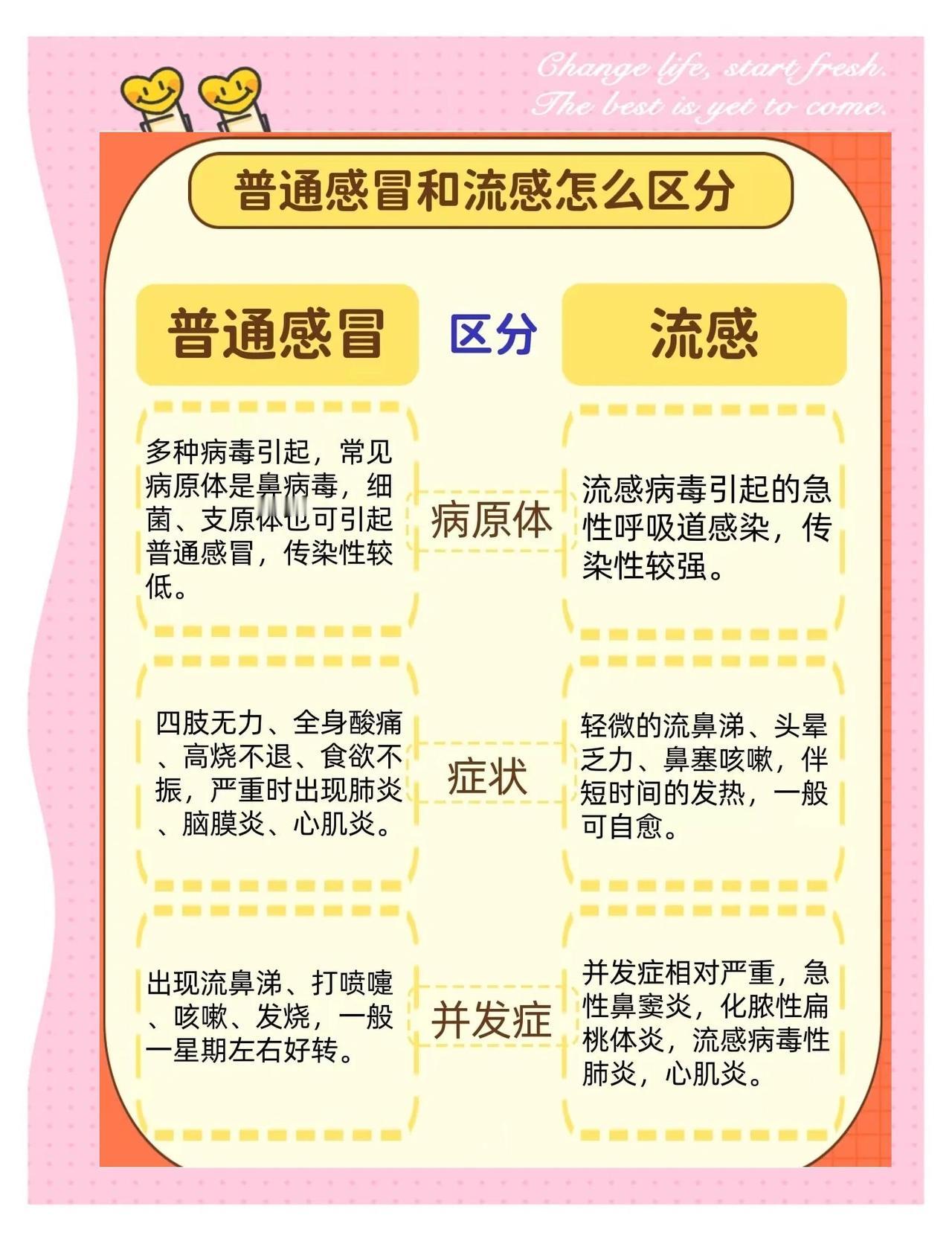 一图区分普通感冒和流感!90%的人都搞错,难怪越治越重 最近身边咳嗽声此起彼伏,办公室一半人戴着口罩“带病上班”,家里孩子咳得整夜睡不好——但你真的分清自己得的是普通感冒,还是流感吗?很多人凭感觉吃药,结果要么小题大做吃错药,要么把流感当成小感冒硬扛,最后拖成肺炎,真的太冤枉! 先上核心区别图(收藏好对照):普通感冒是“慢悠悠找上门”,先鼻塞流涕、喉咙干痒,发烧大多是低烧或不烧,全身酸痛不明显,一周左右靠喝水休息就能扛过去;而流感是“突然暴击”,可能前一秒还好好的,下一秒就高烧39℃以上,头痛、肌肉酸痛到抬不起胳膊,还伴着乏力、咳嗽,严重时会呼吸困难,传染性更是普通感冒的3倍,家里一人中招全家遭殃! 这可不是小题大做!之前有朋友把流感当成感冒,硬扛了3天,结果烧到40℃引发心肌炎,住院一周才好转;还有宝妈给低烧的孩子乱吃退烧药,反而伤了脾胃。其实两者病因完全不同:普通感冒多是鼻病毒、冠状病毒引起,属于“局部战斗”;流感是流感病毒作祟,是“全身免疫系统大战”,尤其是老人、小孩、孕妇这些高危人群,根本扛不得! 更关键的是应对方法天差地别:普通感冒不用急着吃药,多喝水、补维生素、保证睡眠,让免疫系统“练练兵”反而能增强抵抗力;但流感必须早干预,48小时内吃抗病毒药效果最好,每年9-10月接种流感疫苗,是最经济有效的预防方式,重点人群一定要提前安排! 那些说“小病硬扛能增强免疫力”的,前提是你得先分清是不是真的“小病”;而一感冒就猛吃抗生素的,纯属白费功夫还伤身体——抗生素对病毒根本无效,只会让免疫系统越来越“懒”! 现在流感高发季已经来了,别再凭感觉硬扛或乱吃药!收藏这张区分图,对照症状精准应对,既是对自己负责,也是对家人负责。毕竟身体是革命的本钱,正确区分、科学处理,才能少遭罪、不花钱买罪受。