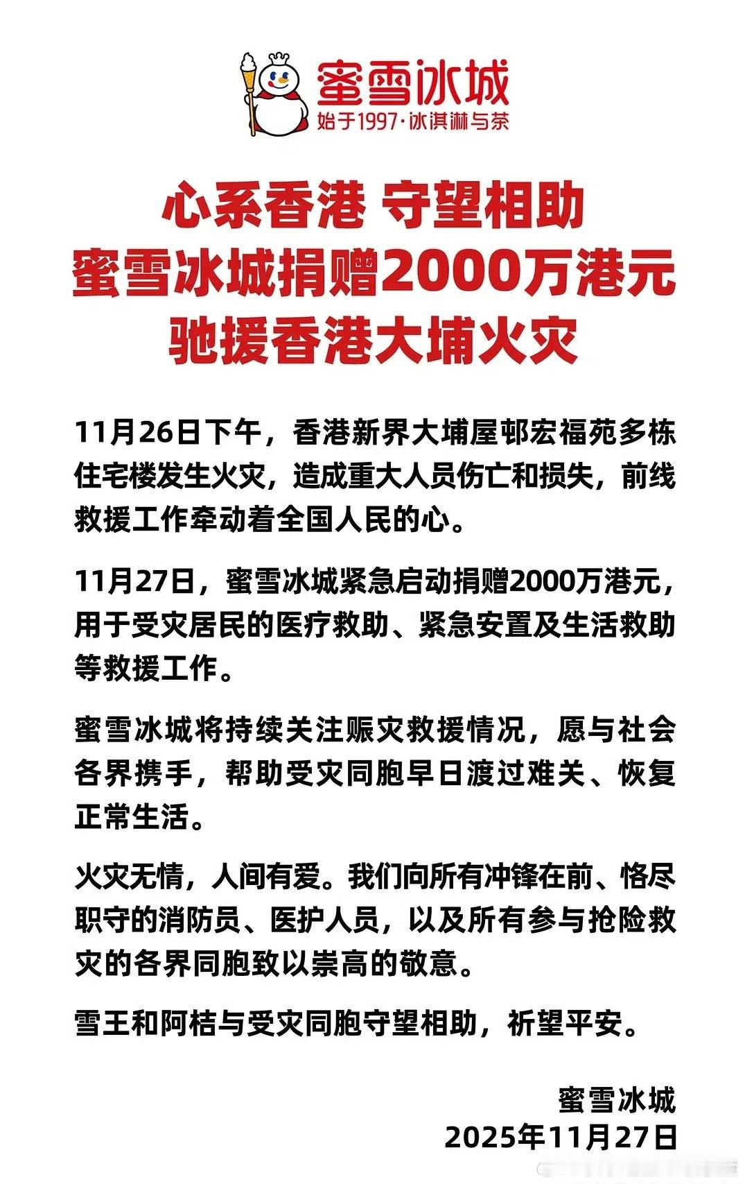 蜜雪冰城给香港火灾捐了2000w