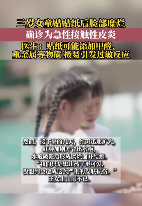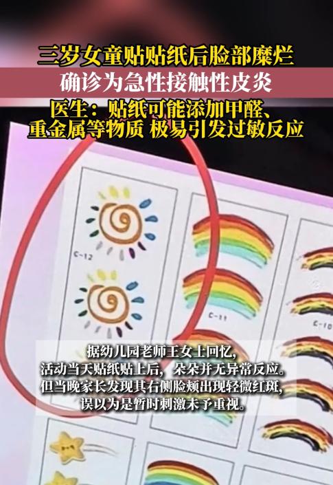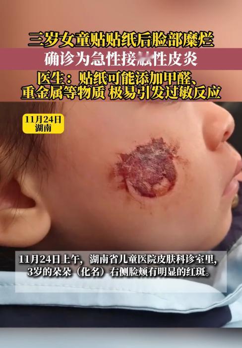 “悲剧还是发生了!”11月24日,湖南长沙,一幼儿园老师为了筹备活动,在小女孩脸上贴了装饰贴纸,放学回家后,女孩脸上出现轻微红斑,但是家长并未重视,几天后,红斑的范围迅速扩大,破溃后糜烂结痂!网友:一看就是三无产品。 家长抱着孩子冲进急诊室时,医生看着那张布满糜烂结痂的小脸,眉头瞬间紧锁——这已经不是个例。 被大家叫做“朵朵”的小女孩,此刻正因为脸部的刺痛而不停抽泣,她不知道,那张老师亲手贴上的“小公主贴纸”,会变成毁容的“元凶”。 幼儿园教师王老师后来在接受询问时反复说:“就是网上随便买的,想着孩子们演出时贴脸上好看。” 谁能想到,这份“好看”的代价,是孩子脸上可能留下永久疤痕。 在不少幼儿园,用贴纸作为奖励或活动装饰已成常态——从“小红花”到卡通图案,孩子们常因额头或脸颊上的贴纸感到自豪。 但自豪背后,隐藏着多少家长看不见的风险? 朵朵回家后,家长发现红斑时曾犹豫要不要去医院,“以为就是普通过敏,小孩子皮肤嫩,过两天就好了。” 这种侥幸心理,让轻微红斑在三天内演变成大面积糜烂。 皮肤科医生在诊断书上写下“急性接触性皮炎”后,特意翻看了那张贴纸的包装——没有生产厂家,没有成分说明,更没有儿童皮肤安全检测报告。 “儿童皮肤角质层厚度仅为成人的1/3,防御功能较弱,不合格贴纸中的甲醛释放体、重金属或刺激性染料,会直接破坏皮肤屏障。”医生指着检测报告解释。 并非所有贴纸都如此危险。 正规儿童贴纸会明确标注“皮肤接触用”“不含甲醛”等字样,且黏合剂多采用水性环保材料,使用后即使残留印记,用温水擦拭即可脱落。 但在电商平台搜索“幼儿园装饰贴纸”,价格从几分钱到几元不等,销量靠前的多款产品,详情页里找不到任何安全检测信息。 家长懊悔的泪水滴在孩子脸上时,或许才真正明白:给孩子用的东西,“便宜”和“好看”从来不该是首要标准。 当幼儿园老师采购时只看价格和款式,当家长发现异常后选择观望,当监管环节对这类小额儿童用品缺乏抽检——悲剧的发生,似乎早已埋下伏笔。 这场意外撕开的,不仅是一张孩子的脸,更是儿童用品安全监管的一道裂口。 下次再给孩子贴贴纸前,不妨先问自己:这张贴纸,真的安全吗?