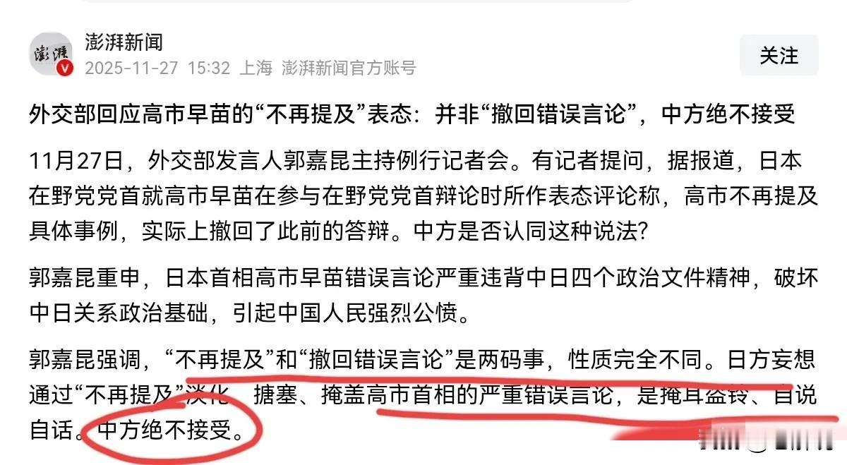 高市早苗要是识趣,就应该公开表示支持一个中国原则,日本不会介入中国的内政!现在倒好,跟我们打马虎眼,以为可以骗过我们,没想到我们外交部发言人再次直接挑明称,“不再提及”与“撤回错误言论”是两回事,中国绝不接受。很显然,我们这样的表态这等于是接着对高市早苗进行外交反击。 11月7日,日本首相高市早苗公开发表涉台错误言论。她声称如果台湾海峡有事,可能构成日本的“存亡危机事态”,日本将可能行使集体自卫权进行干预。 这种言论公然违背了一个中国原则和国际关系基本准则,是对中国内政的粗暴干涉。中国政府迅速作出反应,外交部发言人明确要求日方立即纠正错误,收回恶劣言论。 然而,面对中方的严正抗议,日本政府不仅没有诚恳认错,反而采取了一系列试图蒙混过关的做法。 日本政府在内阁会议上确定了答辩书,声称高市早苗的言论“并不意味着改变政府的一贯见解”。 更有甚者,高市早苗在后续表态中避重就轻,对具有国际法效力的《开罗宣言》和《波茨坦公告》避而不谈,却突出强调非法无效的“旧金山和约”。这种玩弄文字游戏、企图淡化错误言论严重性的做法,无疑是错上加错。 针对日方的这种态度,中国外交部发言人一针见血地指出,“不再提及”和“撤回错误言论”是两回事,性质完全不同。 日方妄想通过不再提及的方式来淡化、搪塞和掩盖严重错误言论,是掩耳盗铃、自说自话,中方绝不接受。这一表态彻底戳穿了日本政府试图蒙混过关的企图,明确表达了中方在这一问题上的原则立场。 这一事件不仅关乎中日双边关系,更涉及战后国际秩序的严肃性问题。《开罗宣言》和《波茨坦公告》等国际法律文件明确确认了中国对台湾的主权,而日本在1972年的《中日联合声明》中也承认中华人民共和国政府是中国的唯一合法政府。 高市早苗的言论和日方事后的辩解,不仅是对中国内政的干涉,更是对历史事实和国际法理的公然挑战。 值得关注的是,日本政府的错误行径不仅引发中方的坚决反对,也在日本国内和国际社会引起广泛批评。 日本前首相鸠山由纪夫指出,中国对高市早苗的错误言论提出批评是理所当然的。日本国会议员小泽一郎强调,高市必须谨言慎行,尤其是在台湾问题上。 韩国专家权起植则直指高市的行为是“背叛外交信义的卑劣之举”。这些声音表明,日本政府的立场在国际上十分孤立。 目前,这一事件的影响正在持续发酵。中日之间的文化交流活动受到波及,中国民众也自发取消赴日旅游计划。更严重的是,如果紧张局势持续,可能影响两国的经济合作和供应链稳定,进而动摇日本的经济根基。这些后果正是日本政府错误言行所必须承担的代价。 纵观整个事件,中国政府的回应既有理有据,又坚定有力。中方不仅捍卫了国家主权和领土完整,也维护了国际关系基本准则和战后国际秩序。 日本政府如果真有改善关系的诚意,就必须正视历史,纠正错误,而不是玩弄文字游戏企图蒙混过关。在涉及中国核心利益的问题上,任何含糊其辞和投机取巧都是行不通的。