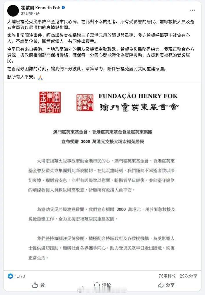 危难时刻挺身而出,一方有难八方支援。 当香港大埔宏福苑五级大火吞噬家园的危急时刻,八方支援的力量如星火燎原。 有企业的善款,小米基金会、腾讯、字节跳动、比亚迪、蚂蚁集团同步捐赠1000万港元;阿里巴巴捐款2000万港元并调动菜鸟物流运送应急物资;小鹏汽车、赛力斯集团分别捐款500万港元。安踏集团捐赠总额3000万港元。 亦有深圳市民连夜运送的4000条毛毯,香港本地居民自发组成义工队协助分发物资,东昌街庇护中心六小时内接收200张捐赠床垫,李兆基名下李兆基基金捐款3000万港元。 企业家们也不逞多让,霍启刚代表家族紧急捐赠3000万港元支援香港大埔火灾灾民。 这场灾难虽带来伤痛,但中华民族“一方有难、八方支援”的精神从未褪色,点点星火汇聚成重建家园的希望之光。相信在这份团结与坚守中,宏福苑终将重焕生机,同胞们定能渡过难关、重拾安稳。