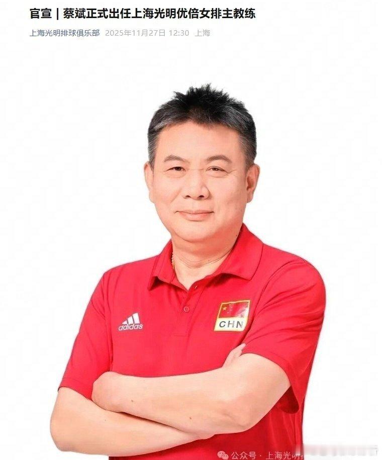 蔡斌回归上海女排任主帅!曾率队四连冠+执教中国女排蔡斌出任上海女排教练 2025年11月27日,上海女排官方正式官宣:蔡斌将担任球队2025-2026赛季主教练。这是这位教头时隔多年后,重新回到自己执教生涯的起点——上海女排的帅位上。作为中国排坛的资深教练,蔡斌的执教履历堪称厚重:1997年,他正是从上海女排开启执教生涯,在任期间一手打造出沪队的黄金时代,率队连续四次登顶全国甲A联赛冠军,奠定了上海女排在国内排坛的强队地位。此后,蔡斌的执教版图拓展至国家队:2022年,他当选中国女排主教练,在三年任期内带领球队完成多个关键赛事突破——2023年率队斩获世界女排联赛亚军(追平中国女排在该赛事的历史最佳战绩),同年在杭州亚运会上以全胜战绩摘得女子排球项目金牌;2024年巴黎奥运会周期,他带领球队历经分站赛突围、奥运资格赛晋级,最终在巴黎赛场获得第五名。此次回归上海女排,蔡斌的备战节奏已迅速开启:在他指导的首次训练课中,球队重点开展了轻技术打磨与体能恢复训练。训练间隙,他也向队员强调“要放下过往比赛的包袱,以全新的精神面貌和高度自律的态度,投入到新赛季的每一次训练、每一场比赛中”,显露出他一贯严谨且务实的执教风格。从当年率上海女排建立王朝,到执掌国家队征战世界赛场,如今蔡斌带着更丰富的执教经验重返沪队,也让外界对上海女排在新赛季的表现充满期待——这支曾被他推向巅峰的球队,能否在他的重新掌舵下再攀新高?