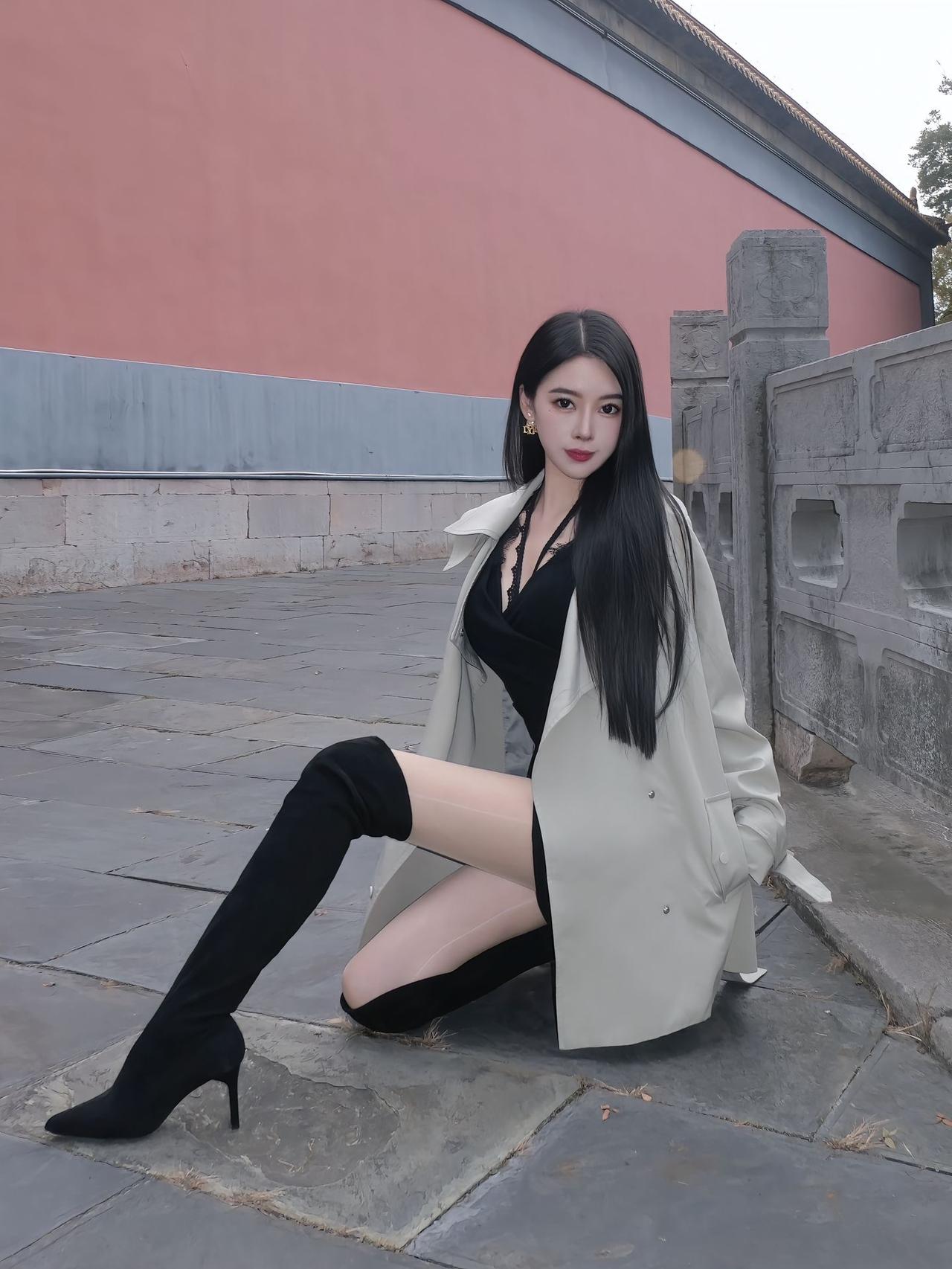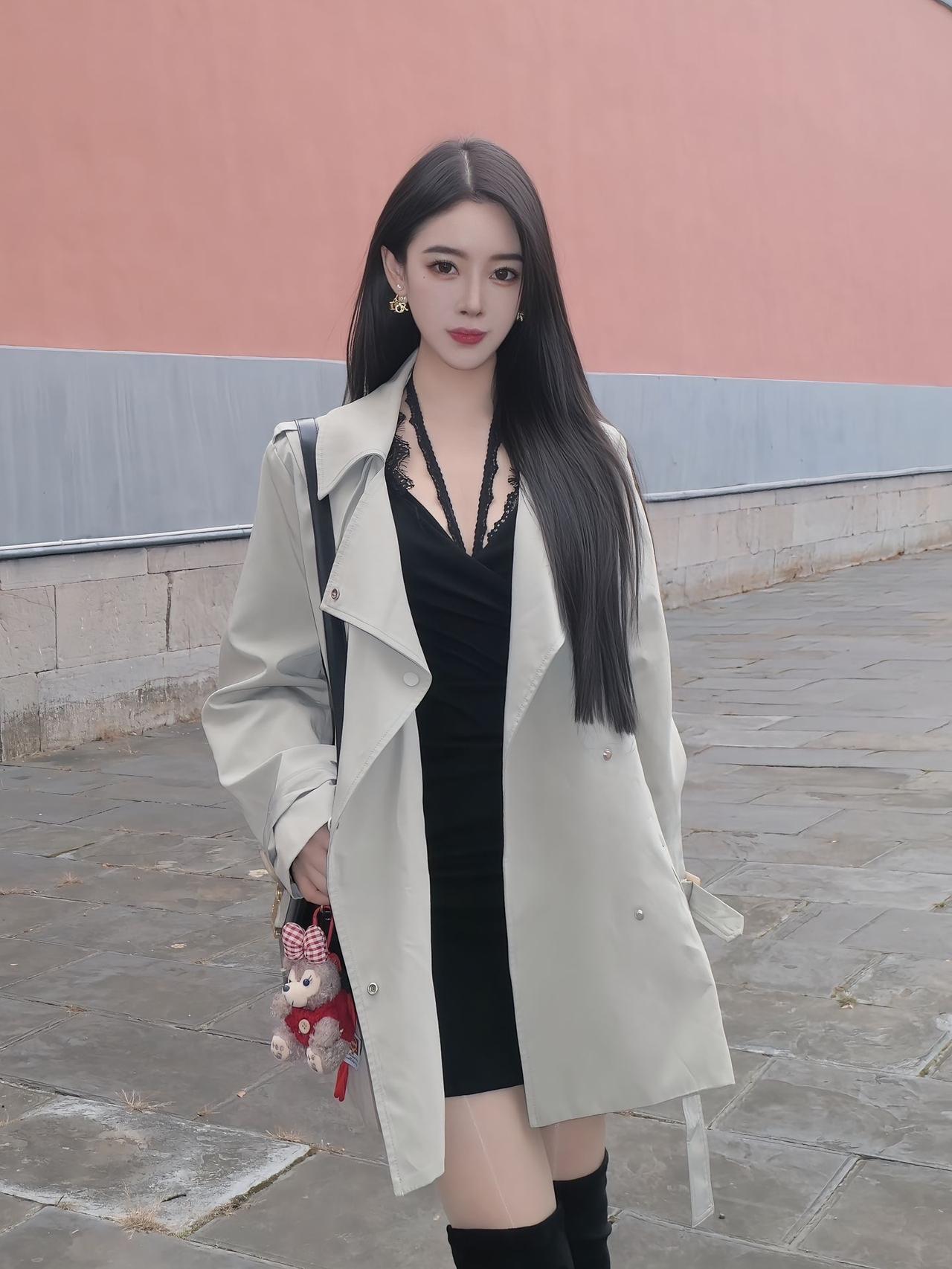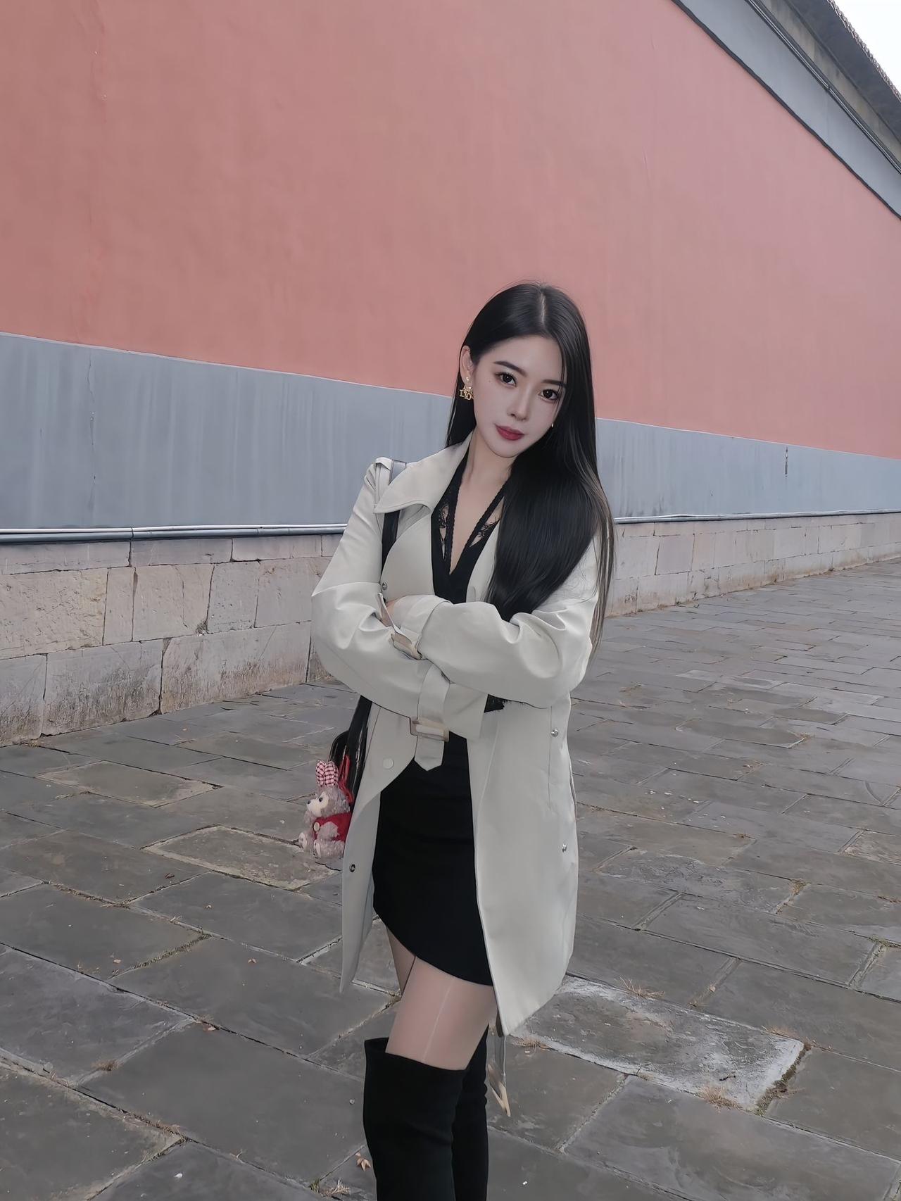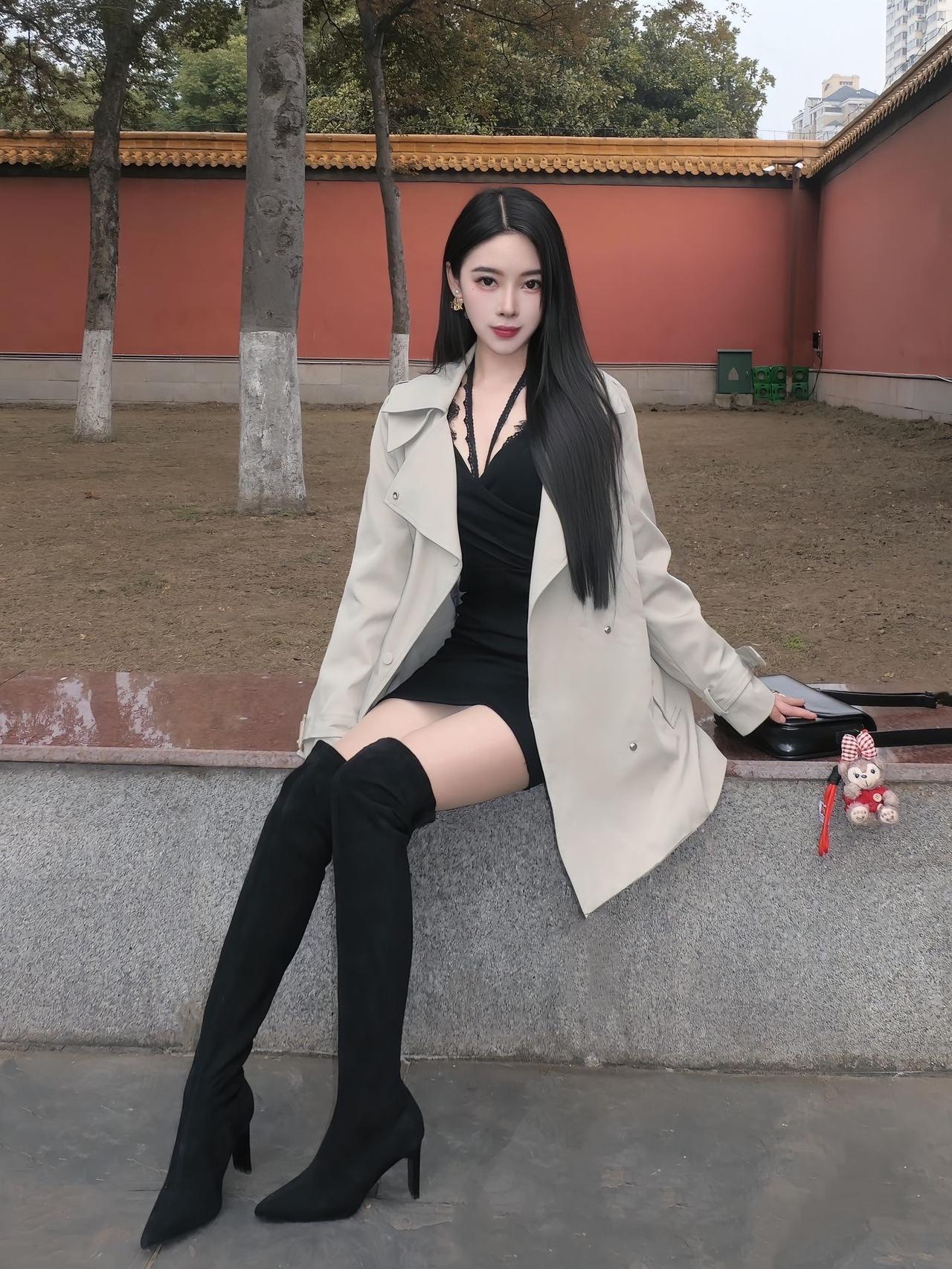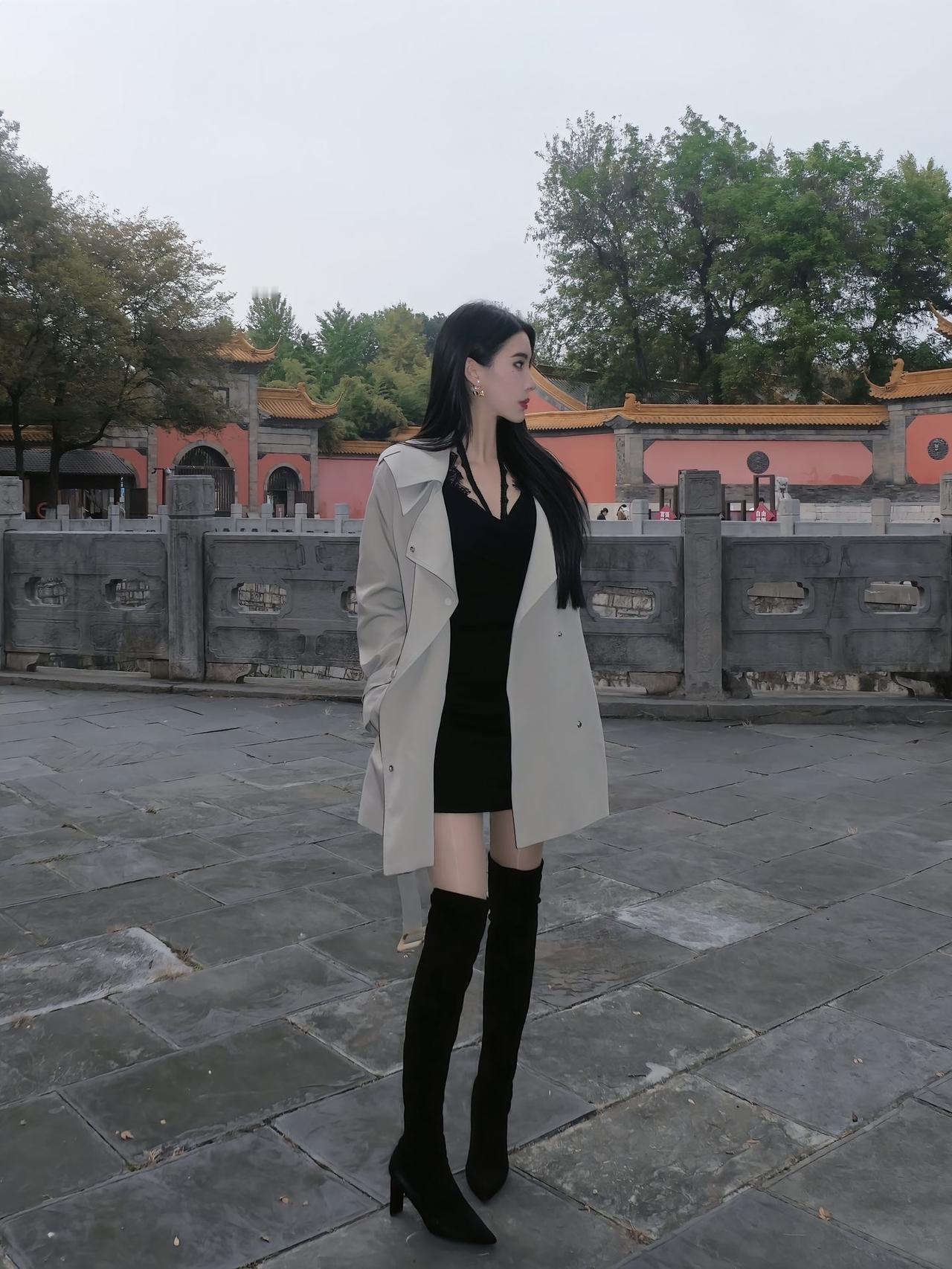 秋日国风打卡穿搭:甜酷感拉满的「新中式混搭」 红砖黄瓦的古建前,这身穿搭直接把氛围感焊在身上! 内搭选了黑色蕾丝吊带裙,轻熟小性感刚好中和风衣的利落;浅卡其长风衣是秋日刚需,垂坠感拉满还能藏肉,敞开穿更显随性;腿上的黑色过膝靴直接把比例拉成“三七分”,细跟自带优雅buff。 古建的庄重和穿搭的甜酷碰撞出反差感,随便站在石板路上都是大片!这种“轻熟风+国风背景”的组合,出片率真的稳赢~怎么搭配过膝靴 御姐