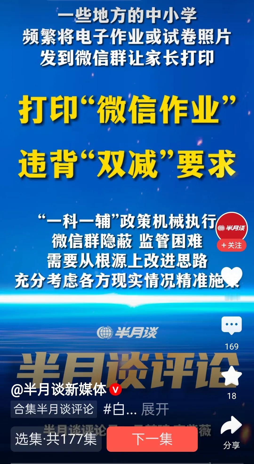 半月谈瞄准了家长群里的作业打印,这是什么信号? 官方媒体半月谈发表,说打印微信作业,违背双减要求 但事实上,现在绝大多数地方的学校都是这么干的 由于教辅不能统一采购,老师为了让学生更好的掌握知识,通常都会找一些资料发到家长群里,让有条件的家长打印给学生去做。 这已经持续了很长一段时间了。 家长也都习惯了,见怪不怪了。 但是现在半月谈突然这么表态,以后会不会发生变化? 要落实双减,减少学生作业,微信作业打印,慢慢会取消的