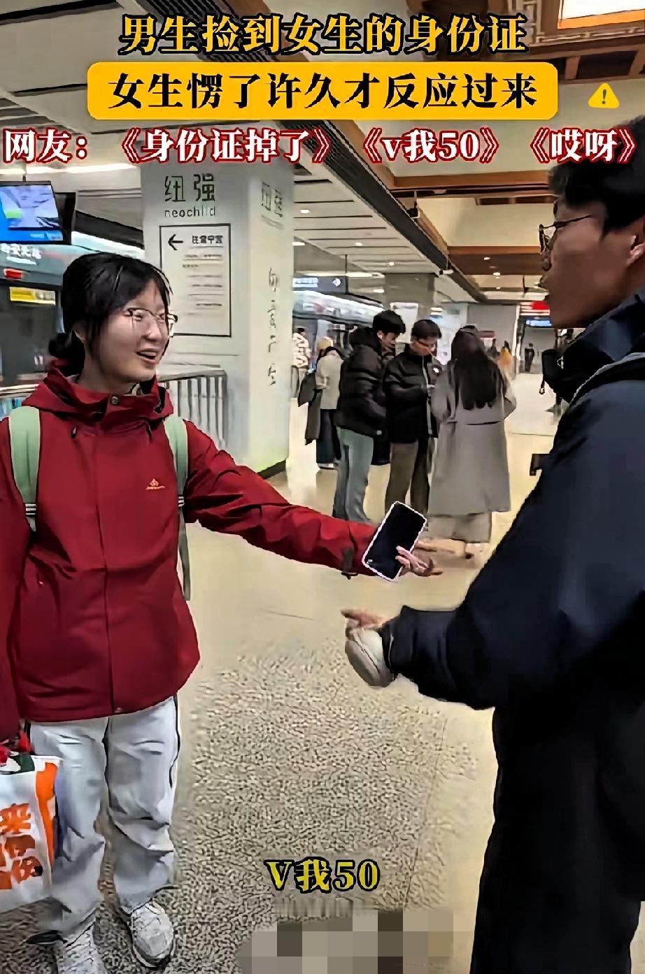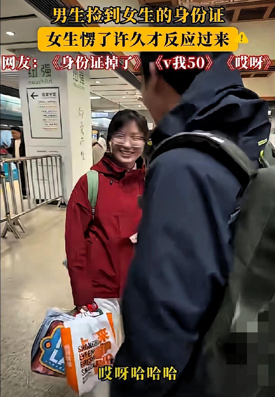 地铁站这幕也太有意思了! 女生听见有人喊自己名字,回头才发现身后高大男生手里攥着她掉的身份证,刚笑着接过想道谢,男生一句“给我五十块”直接让她愣出一声“哎呀”。 网友吵翻了,有人说女生该先道谢才礼貌,也有人调侃那声惊讶的“哎呀”比五十块还值。 但其实哪是真要这五十块啊,更像男生找的小台阶—— 主动还身份证怕尴尬,用玩笑式要“报酬”找话题,大概率是想顺势要微信搭个话,毕竟真心要要钱的人,不会等对方接了证件才开口。 这种有点笨拙的主动,反而比直白搭讪更显可爱,没什么恶意,反而满是年轻人的小机灵。 你遇到过这种有点巧思的搭讪或帮忙方式吗?评论区说说~