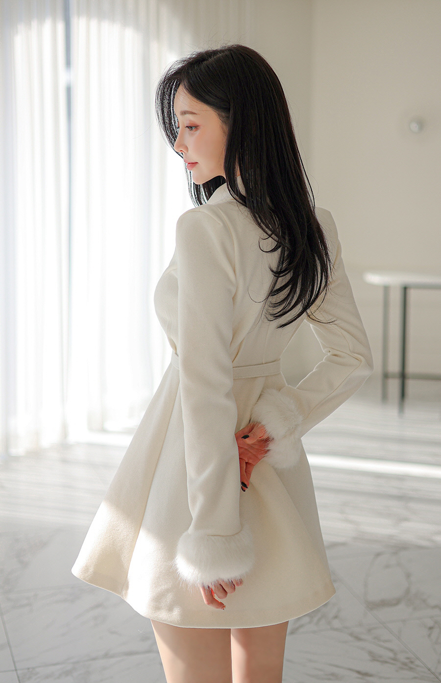 优雅高贵的孙允珠,白色单肩裙,静静地坐在窗边。巧妙地露出一侧精致的锁骨和优美的肩