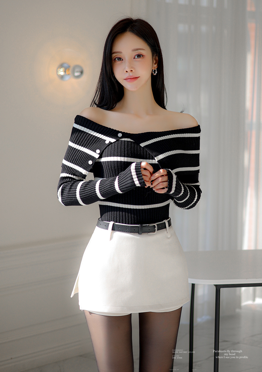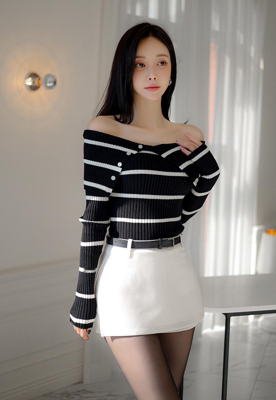 优雅高贵的孙允珠,白色单肩裙,静静地坐在窗边。巧妙地露出一侧精致的锁骨和优美的肩
