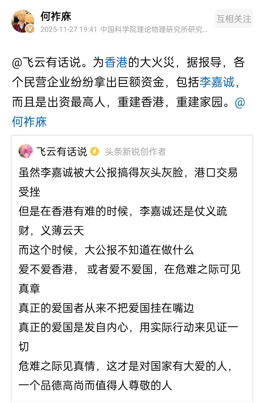 何祚庥老院士谈香港火灾后民营企业献爱心。 香港这次火灾,牵动了所有华夏儿女的心。11月27日晚上7点多钟,何祚庥老院士说香港火灾发生后,各个民营企业纷纷拿出巨额资金,贡献力量。 何老院士进一步补充说到,李嘉诚先生是出资最高的,深刻诠释了“重建香港,重建家园”这八个字。 每一次面对这样的困难时,中华儿女都凝心聚力共渡难关,这是值得传承的宝贵精神。