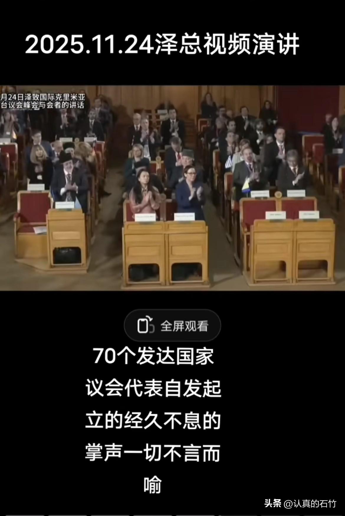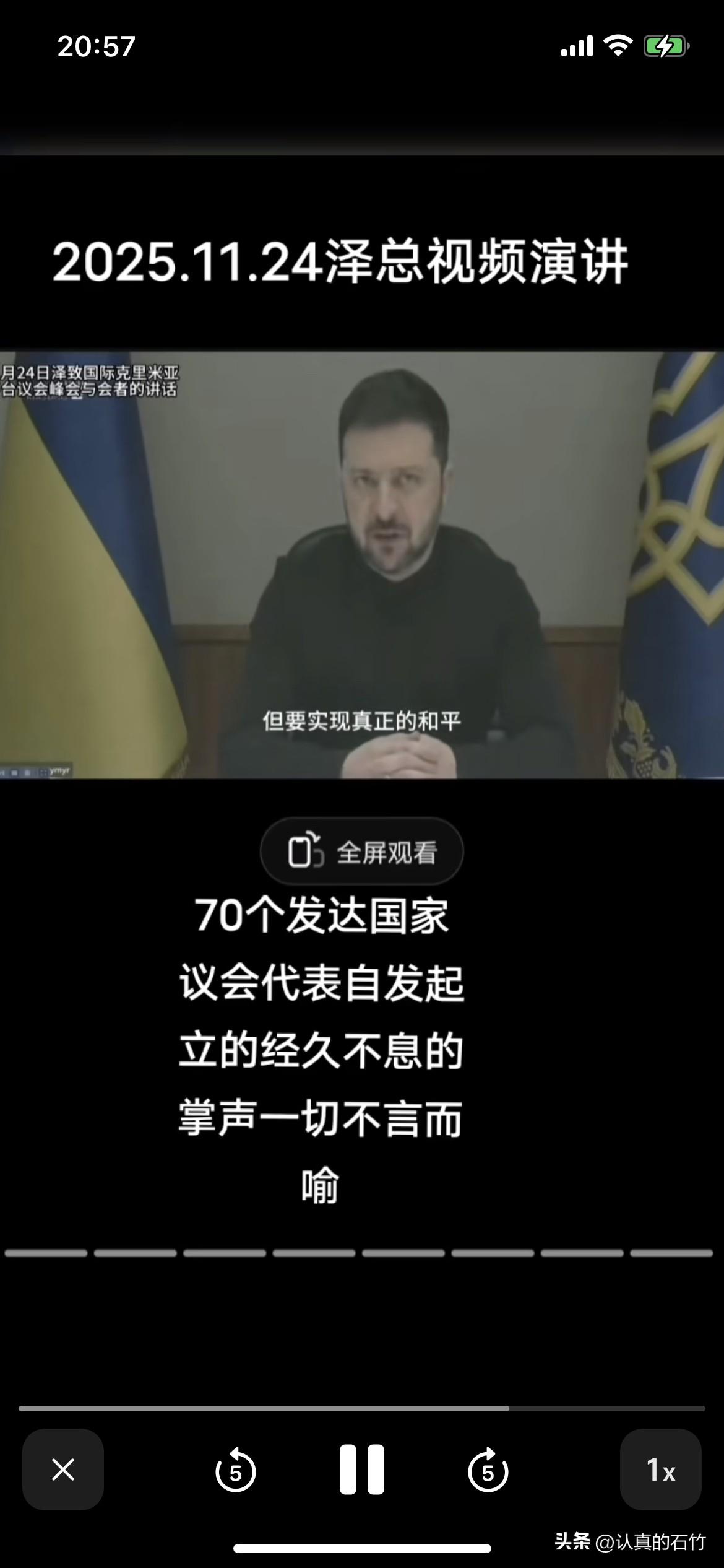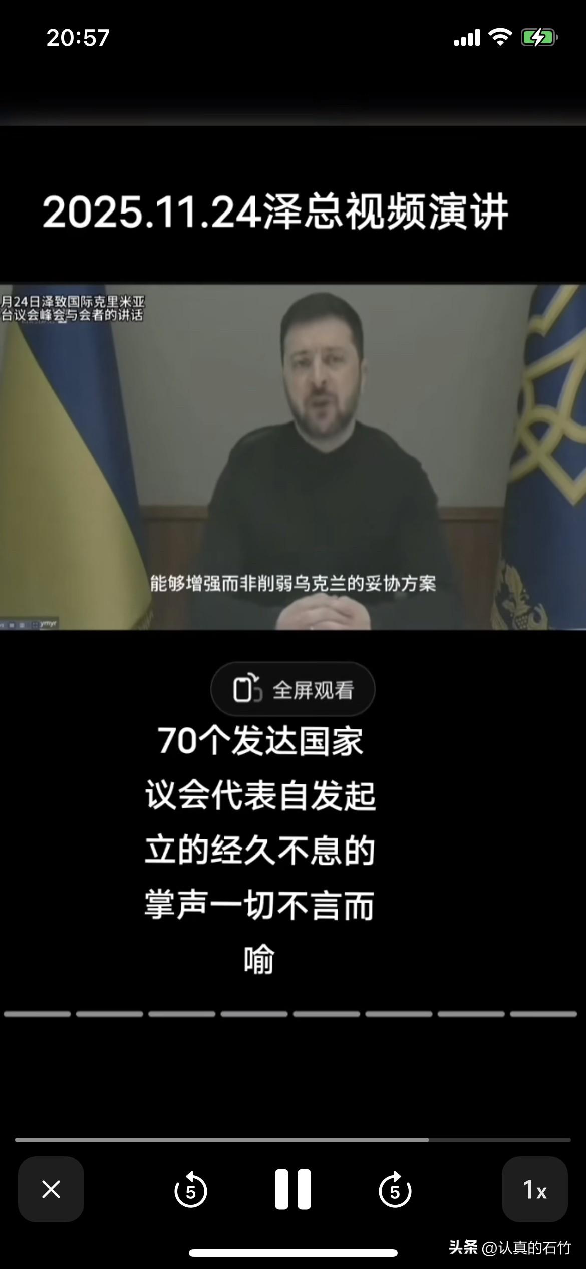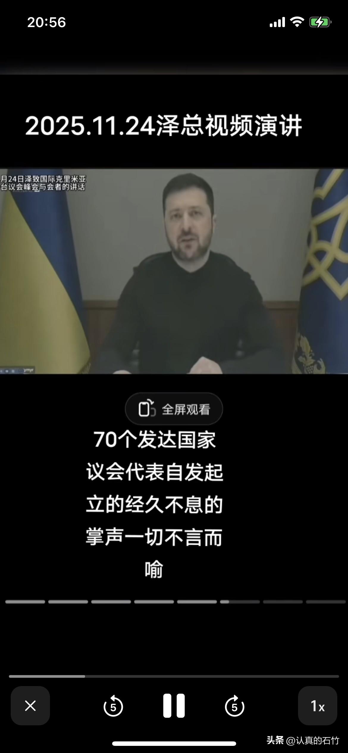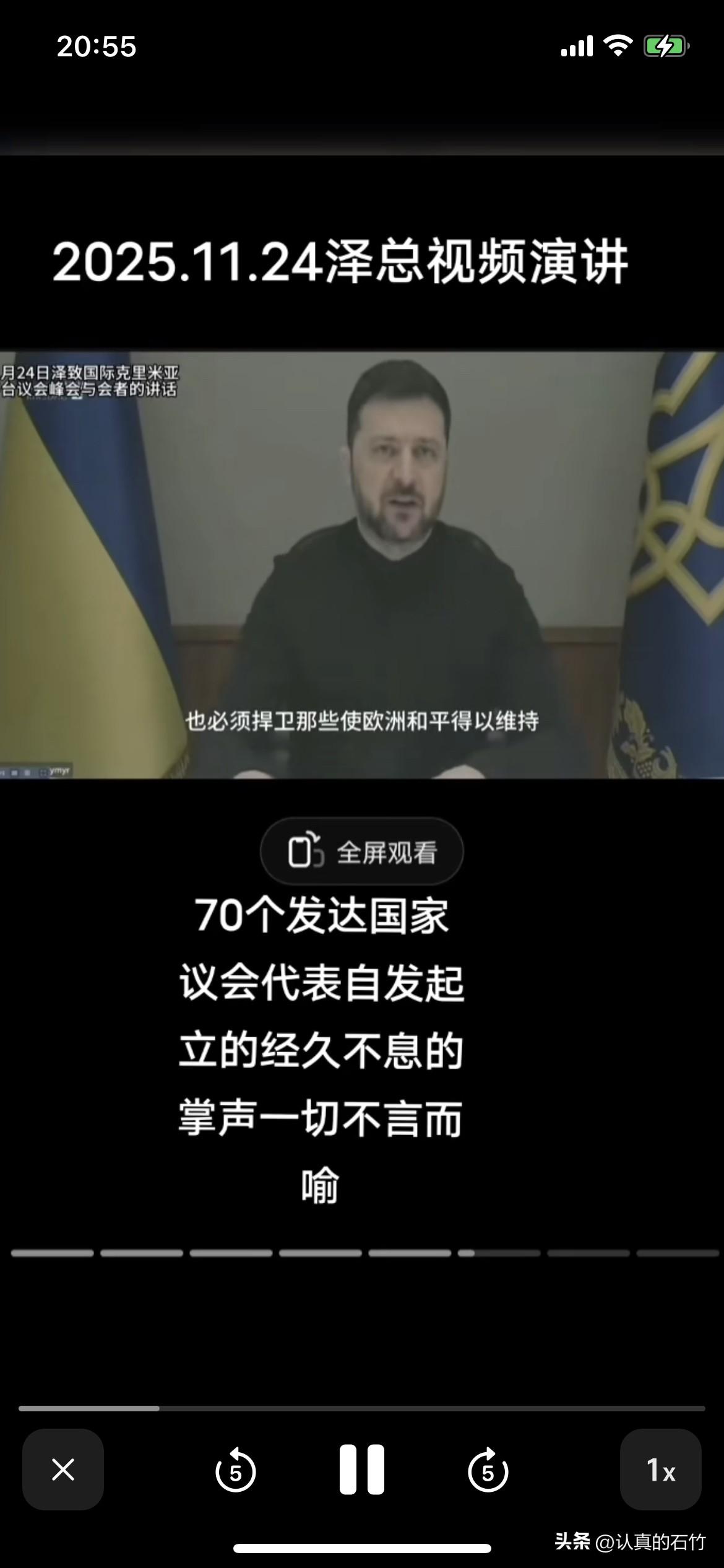 11月24日泽连斯基演讲结束会议代表自发起立鼓掌掌声经久不息。 那么泽连斯基说了什么? 泽连斯基讲话大致意思是,边界不可用武力改变,关于俄罗斯资产的处置必不可少。继续对俄罗斯保持压力。发动侵略的一方必须为其战争承担全部责任。 但是支持乌克兰是需要钱的。谁出钱?欧洲出钱吗?
