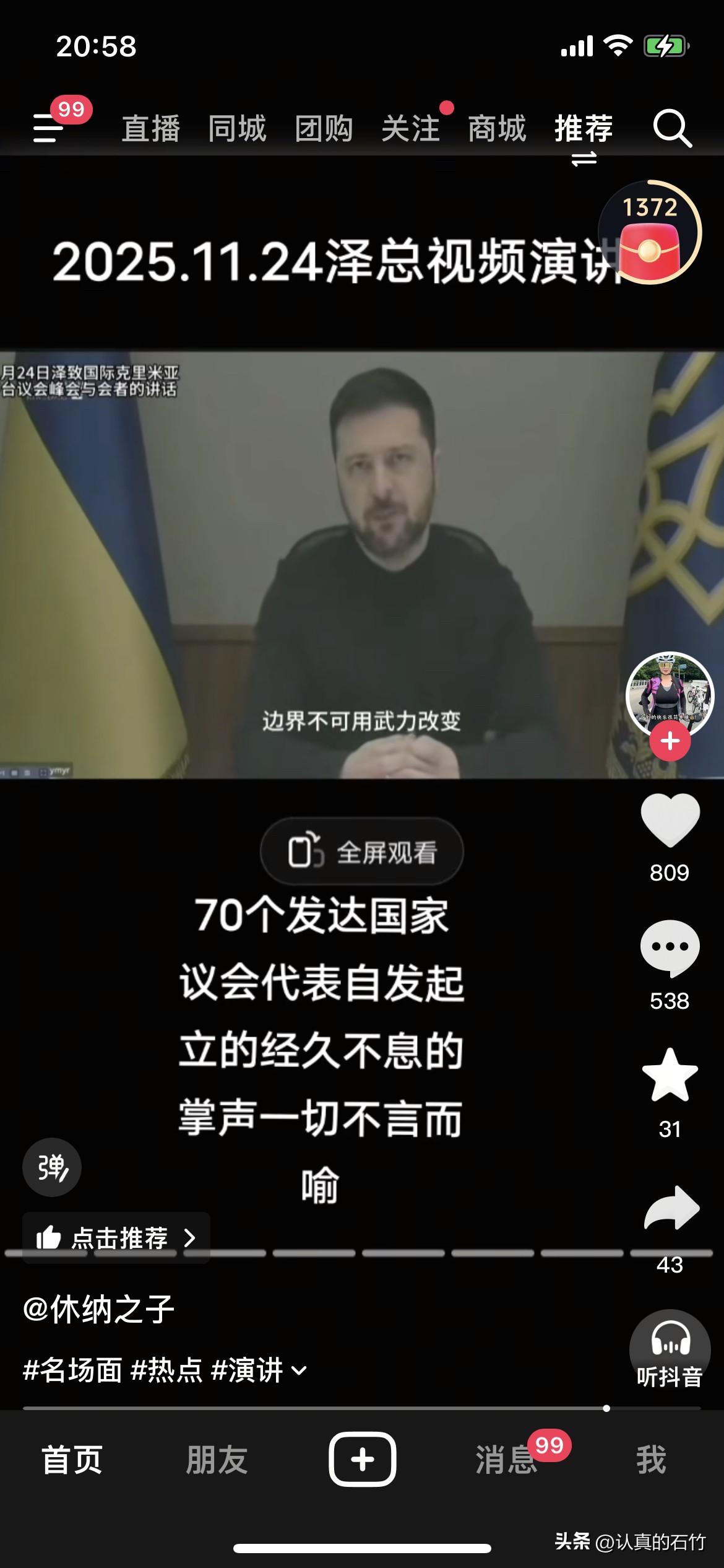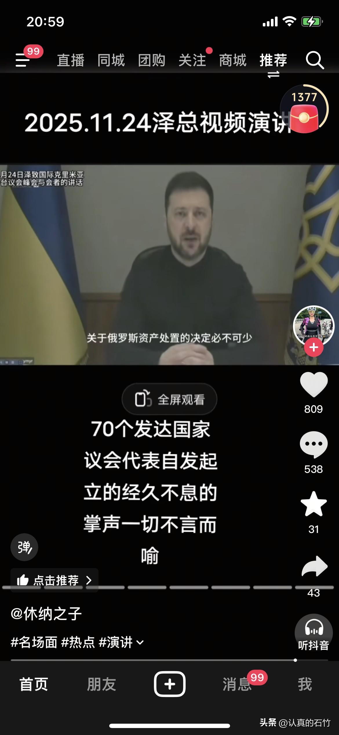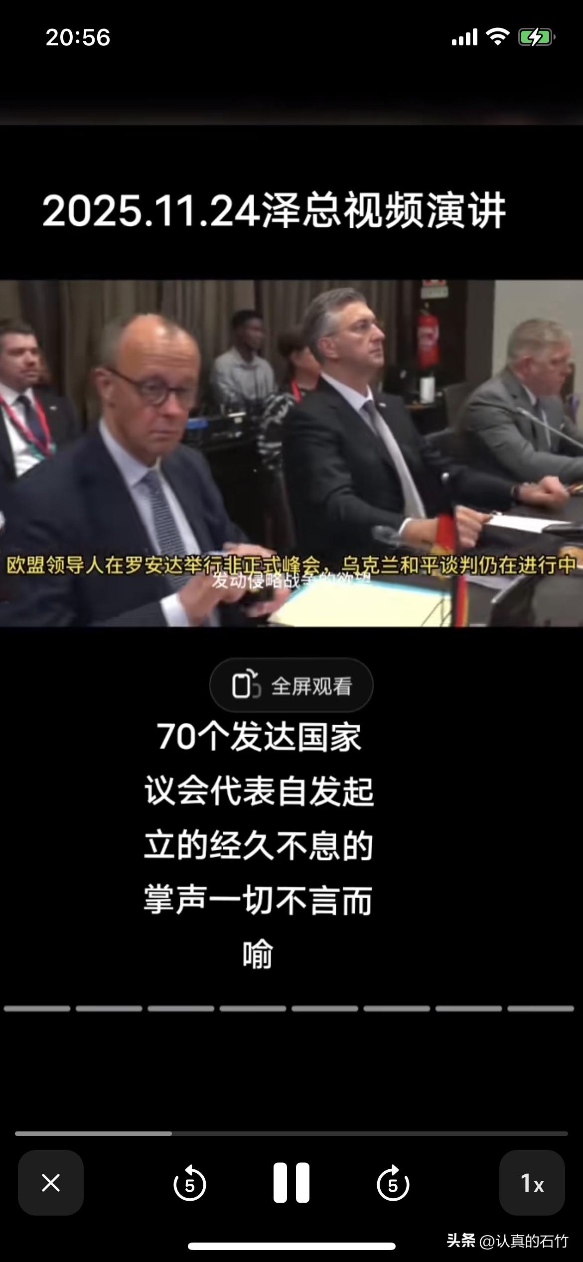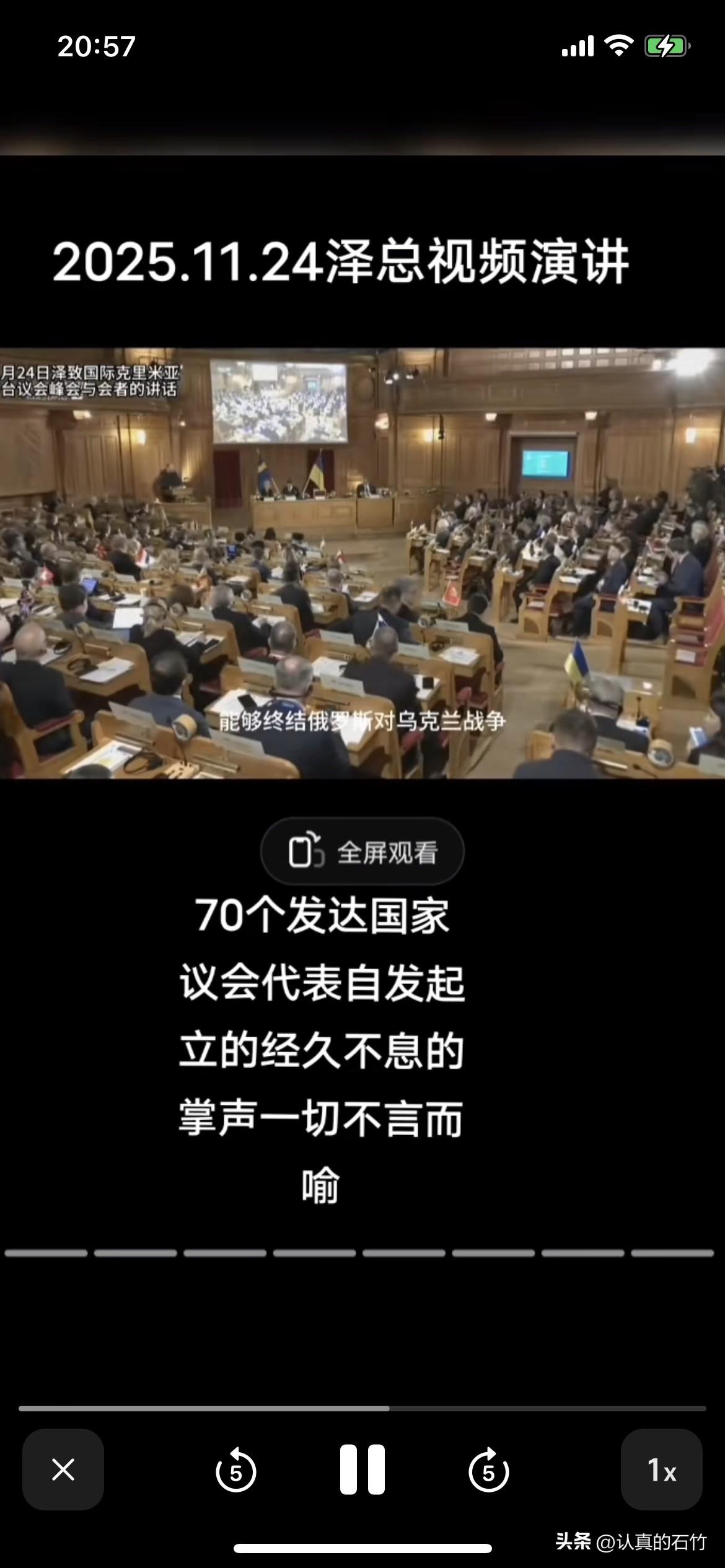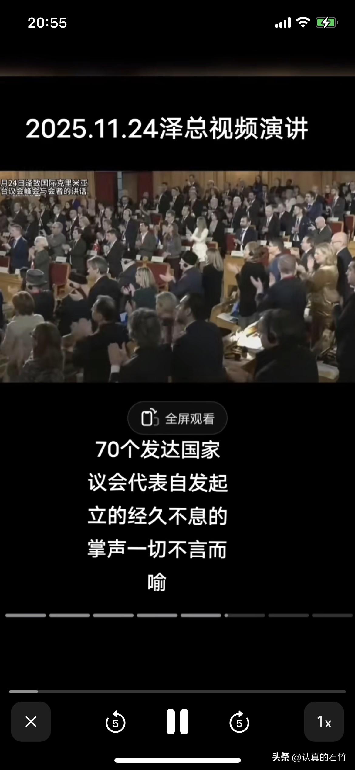 11月24日泽连斯基演讲结束会议代表自发起立鼓掌掌声经久不息。 那么泽连斯基说了什么? 泽连斯基讲话大致意思是,边界不可用武力改变,关于俄罗斯资产的处置必不可少。继续对俄罗斯保持压力。发动侵略的一方必须为其战争承担全部责任。 但是支持乌克兰是需要钱的。谁出钱?欧洲出钱吗?