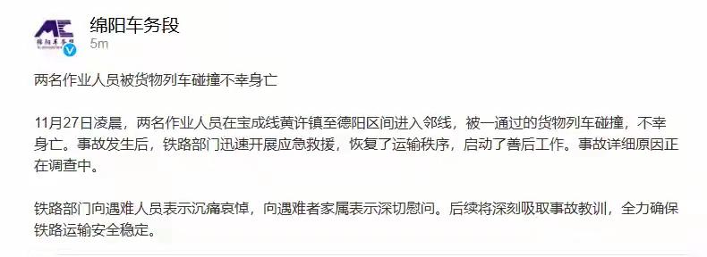 宝成铁路线列车碰撞施工人员2人死亡 这个凌晨的悲剧像一声沉重的警钟,敲响了我们