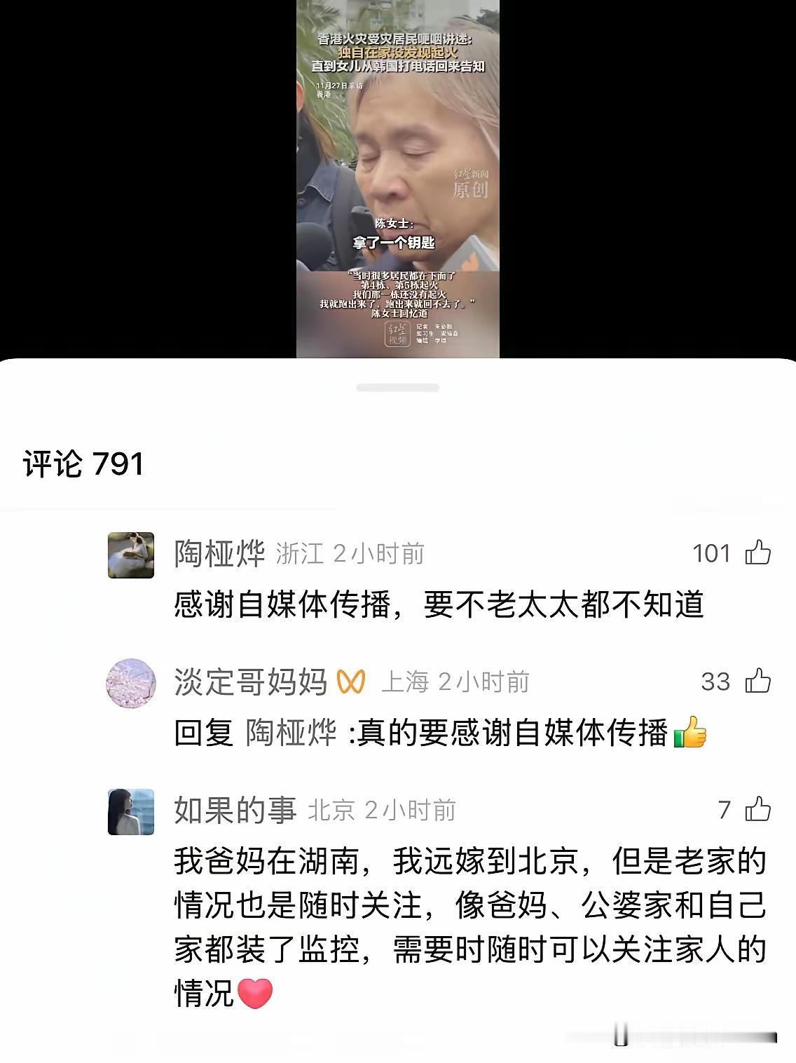 香港这次的火灾,有一位幸存下来的老太太很特殊 不是因为她多有钱,也不是因为她是某某高层 而是因为她这次获救,竟是被远在韩国的女儿给救下来的;当时她正在跟女儿通话,结果女儿忽然问她“妈,你下去看看这层楼底下是不是起火了?” 网友们表示 女儿通过自媒体救了母亲一命,真是太幸运了了。可是那些在这场火灾中遇难的就没那么幸运了,愿逝者安息吧 自媒体超然特快传播,无意中被有心人看到,救了亲人一命。其功在自媒体,其真母女连心。 这说明了什么? 说明第一幢着火时,没想到会火烧连营,没及时撤离别幢的住户 谁看哭了?香港阿婆和韩国女儿通话,靠网上失火视频逃出生天,自媒体这功必须夸[赞][赞][赞][赞][赞][赞] 自媒体虽然大多是一些垃圾视频和文章,但是有时候很及时报道一些事物,让人们第一时间得知真相。 大家怎么看呢