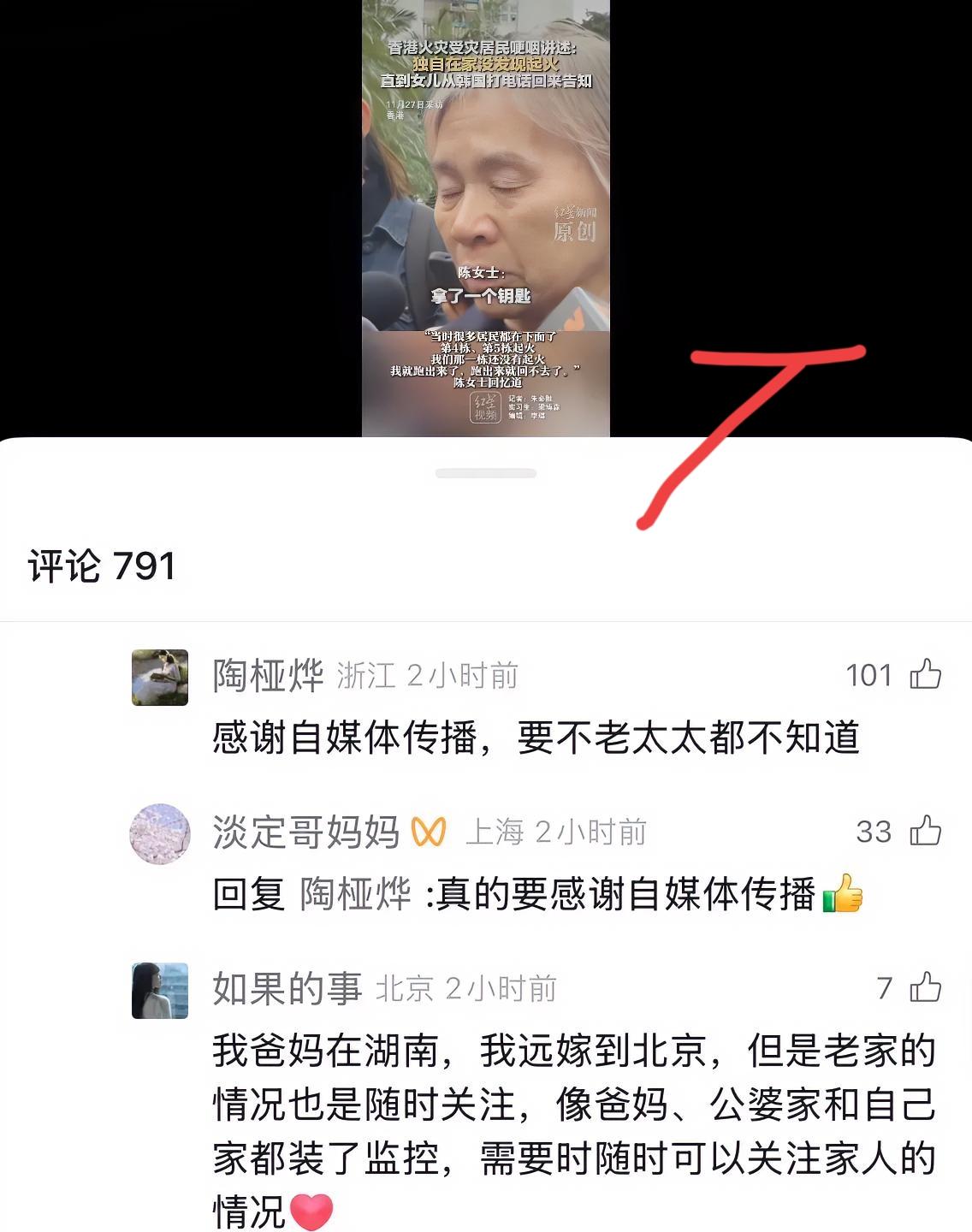 暖心! 快哭了!都说自媒体发展太快乱人心,可这次香港火灾里,它却实实在在救了一命!这事儿真值得说道说道。 11月26号下午,香港大埔宏福苑突然起火,火势凶猛,55条生命瞬间没了,还有很多人受伤。住在3楼的72岁陈阿婆当时正一个人在家带娃,家里其他人都在韩国旅游。火警钟响了,浓烟也冒起来了,可阿婆愣是一点儿没察觉,还在屋里待着呢。要不是在韩国的女儿刷到家乡火灾新闻,立马打电话喊她快跑,阿婆可能就…… 阿婆接到电话,啥也顾不上,抓起手机和钥匙就往楼下冲。跑出来一看,4栋、5栋已经烧得通红,火舌都快舔到旁边楼了,自己住的3栋还没着火。她当时还傻乎乎想回家拿东西,幸好被邻居一把拉住。现在想想,真是万幸中的万幸,要是回去,后果不堪设想。 这事儿也让人明白,自媒体虽然有时候让人烦,但关键时刻真能派上用场。就像这次,要不是女儿时刻关注着家乡动态,阿婆可能就…… 作为写这篇文章的人,我觉得这事儿真是让人又后怕又感慨。大家平时可得多关心关心身边老人,让他们也多留意点信息。觉得我说得在理,就点赞、转发支持一下,关注我,咱们一起多聊聊这些事儿! [免责声明] 文章的时间、过程、图片均来自于网络,文章旨在传播正能量,均无低俗等不良引导,请观众勿对号入座,并上升到人身攻击等方面。观众理性看待本事件,切勿留下主观的恶意评论,互联网不是法外之地。本文如若真实性存在争议、事件版权或图片侵权问题,请及时联系作者,将予以删除。谢谢!