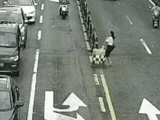 这位白衣黑裙女子心太急,再急也不能连续横穿马路不顾及自己!有驾照的摩托车司机让着你,没驾照的电动三轮司机可不惯你! 所以,我们每位交通参与者,必须自觉维护交通秩序。否则,出了交通事故,不仅自己受罪,还没人赔钱给你。