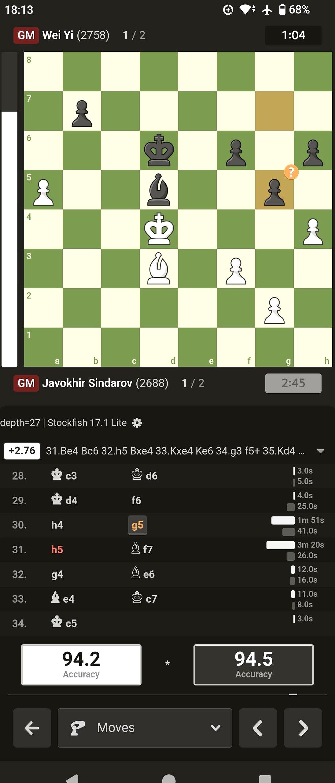 第一盘快棋刚刚结束。 咱们小韦执黑后手,被对手压得几乎喘不过气,他硬是把这盘必输的棋给顶住了。那颗悬着的心总算能放下一半了。 他就是凭着那股子韧劲,在几乎没路可走的地方走出一条路来,所以才把比分扳平了。他用这盘和棋宣告,决赛的战斗才刚刚开始。