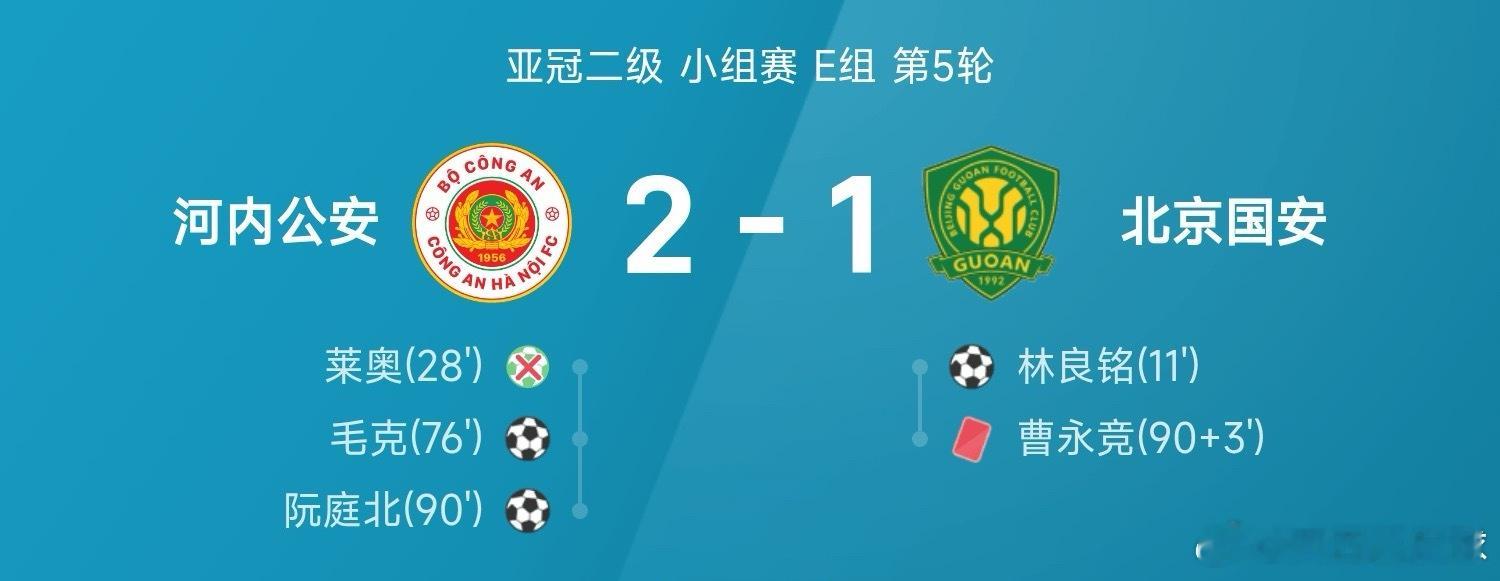 亚冠二级战报:张健智扑点、阮庭北绝杀,河内2-1淘汰国安河内公安vs北京国安 11月27日讯 25/26赛季亚冠二级小组赛E组第5轮,河内公安2-1战胜北京国安,阮庭北第90分钟上演绝杀。全场比赛,毛克、阮庭北破门建功,林良铭破门难救主,莱奥失点,曹永竞染红。河内公安2比1北京国安