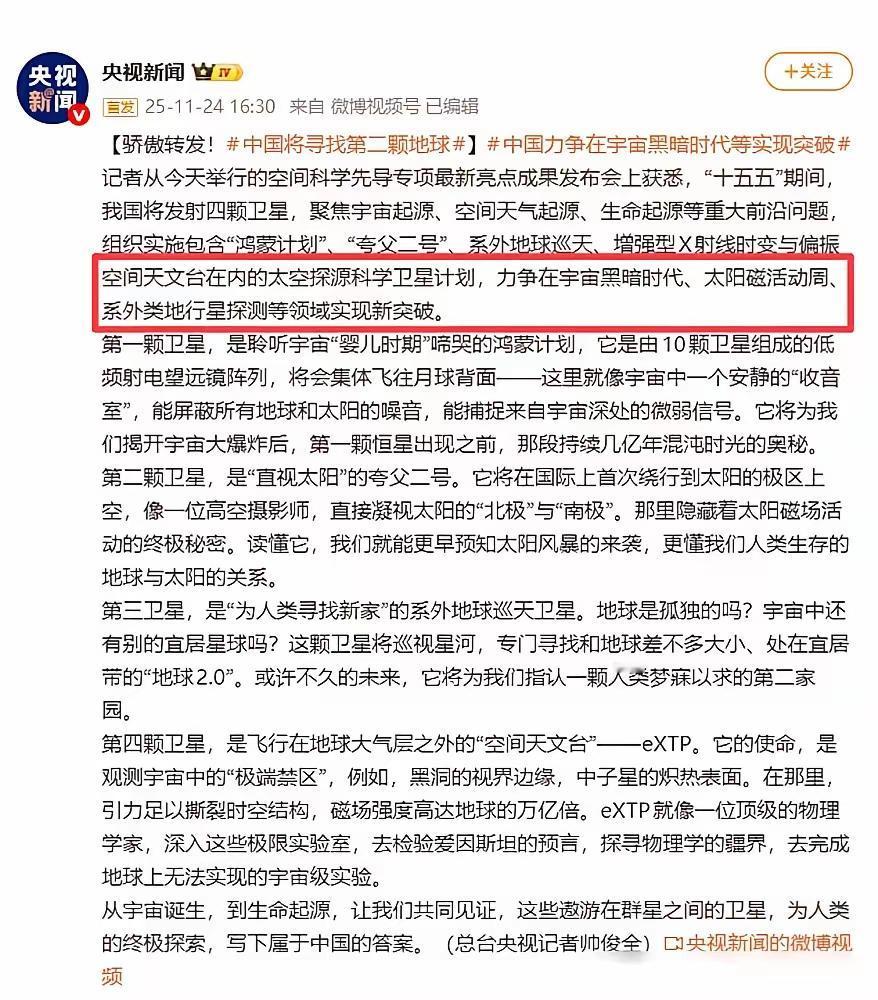 快讯!快讯! 央视新闻一条不算特别火的新闻,竟然让我这个航天迷激动不已。 “十五五”期间,东方大国计划发射四颗卫星,专注于宇宙起源、空间天气起源和生命起源等热门领域。其中有“鸿蒙计划”、“夸父二号”、寻找系外地球的卫星、增强型X射线天文台。这四颗卫星探测的目标分别是:宇宙黑暗时代、太阳磁活动周、系外类地行星。这些探索是科学研究的最前沿,但与我们的生活息息相关,能够为未来的科技发展奠定基础。 作为航天迷,看到国家在这些领域投入这么多,我无比自豪,也无比期待! 网友热评: 从“夸父追日”到“鸿蒙探宇”,东方大国把神话照进太空!四颗卫星直击三大起源,这哪里是航天计划,分明是给宇宙写“终极答卷”的野心! 不炒热度只搞硬核探索——“十五五”航天四件套,把目光钉在宇宙最前沿!作为航天迷,看着国家一步步解锁“宇宙密码”,自豪感直接冲上九霄!