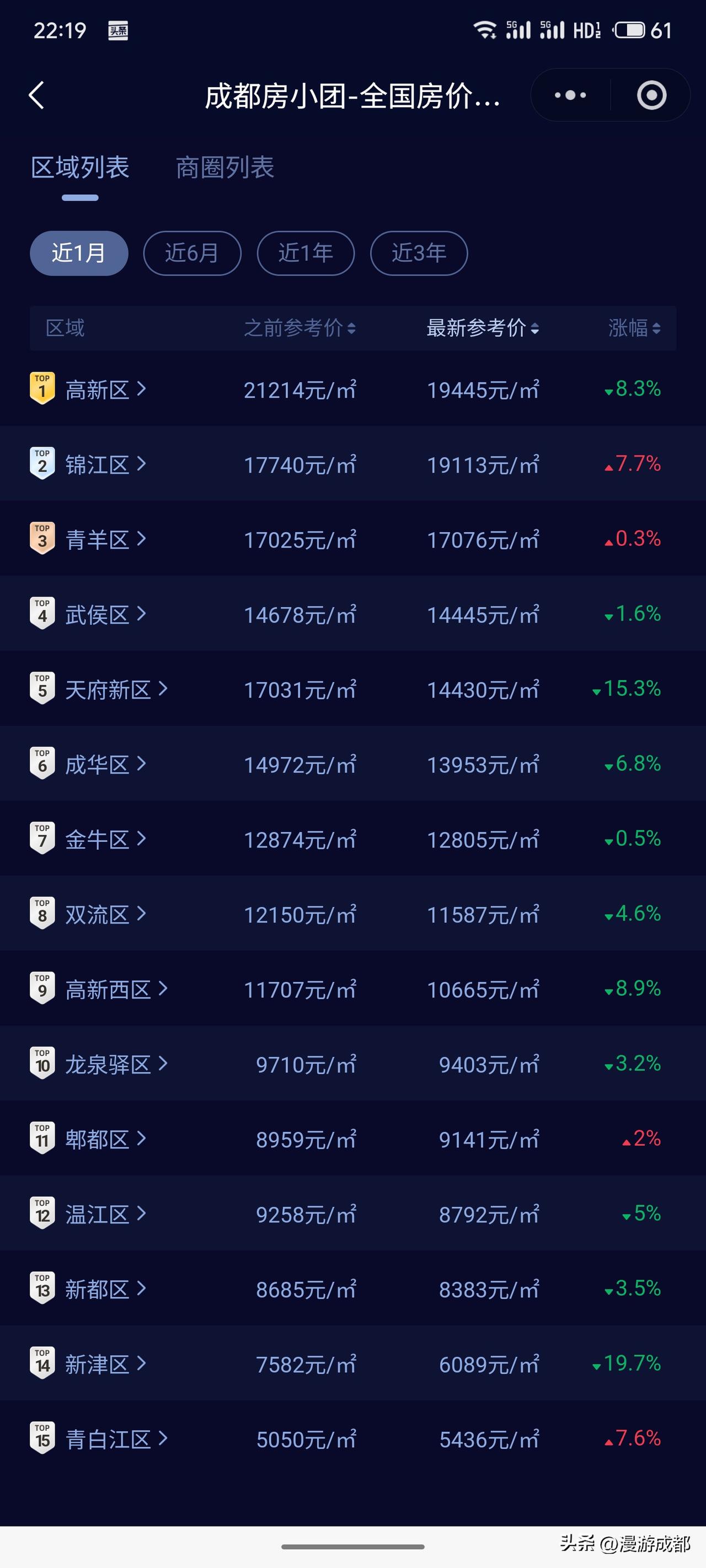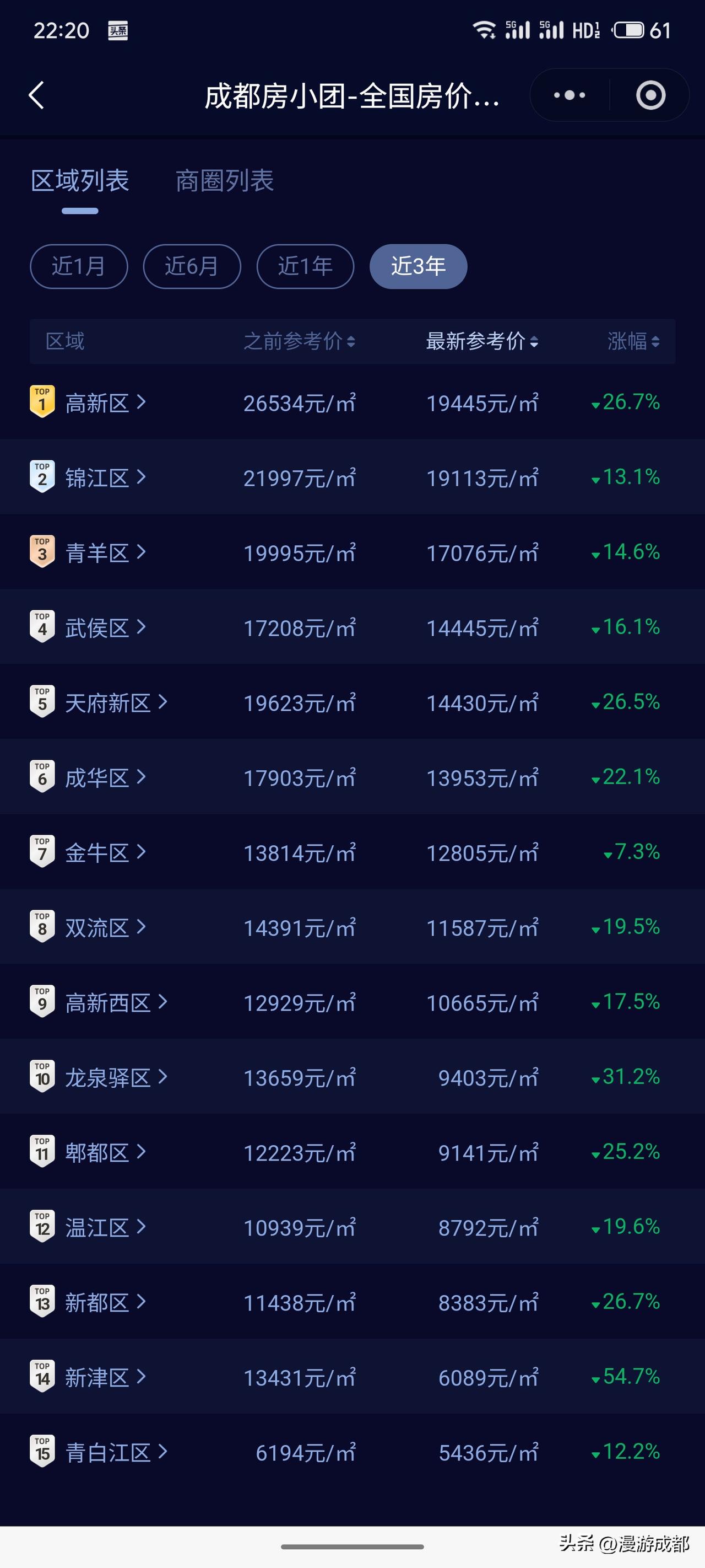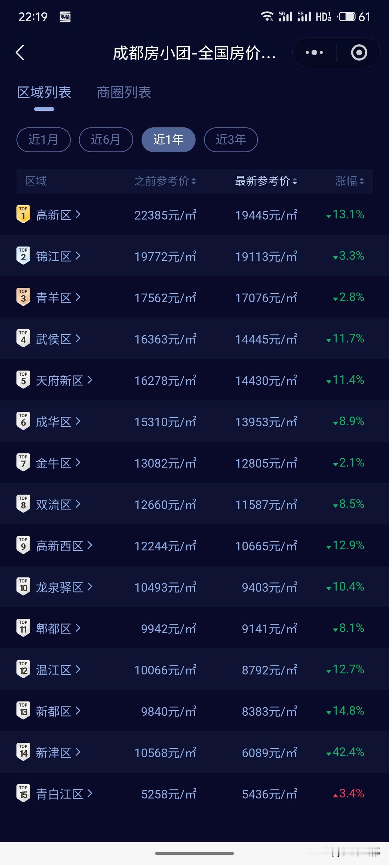 成都新津和天府新区的房子跌的这么惨吗? 近一个月新津房价跌了19.7%,近一年跌了42.4%,近三年跌了54.7%,成为成都房价跌的最惨的区! 而天府新区近一个月跌了15.3%,近半年跌了25.6%,说明近期在加速下跌了! 整体来看,成都平均房价已经跌回到2017年的水平了,最坚挺的还是主城区5+1! 现在有多少人买房亏了首付了,有多少人房价不抵贷款破发了啊?