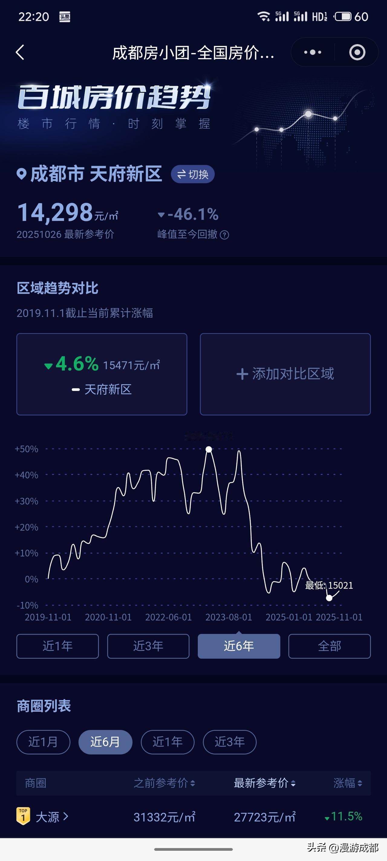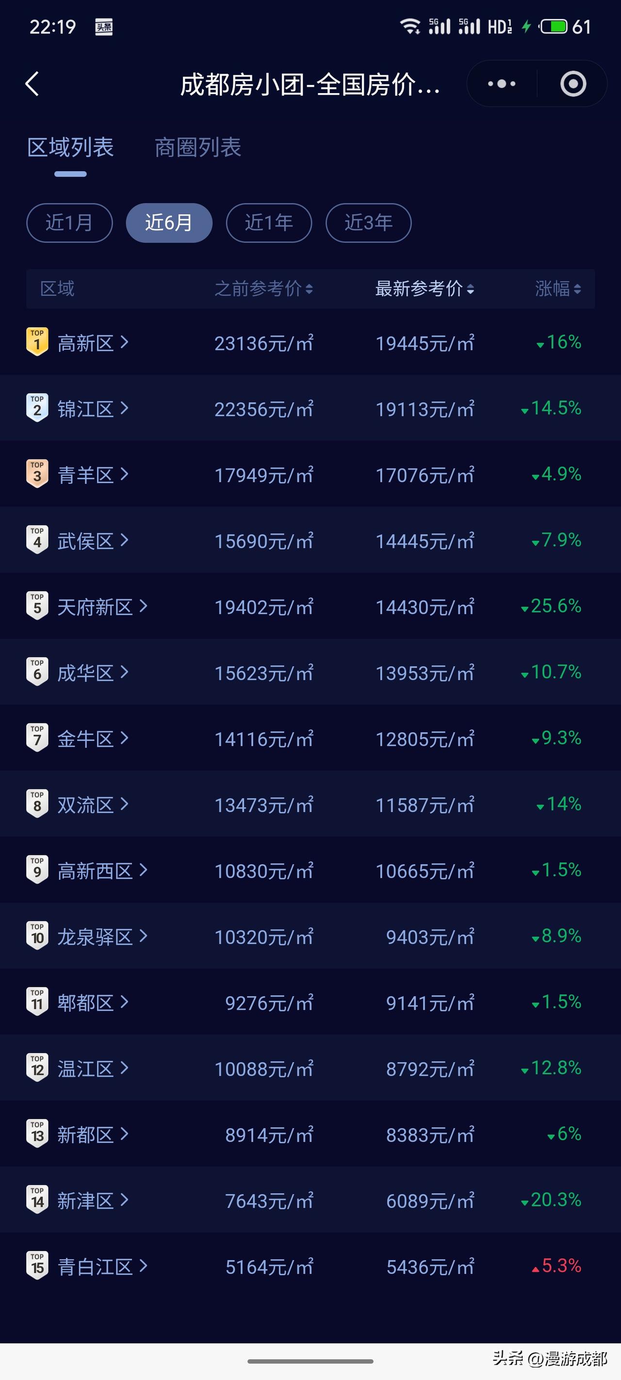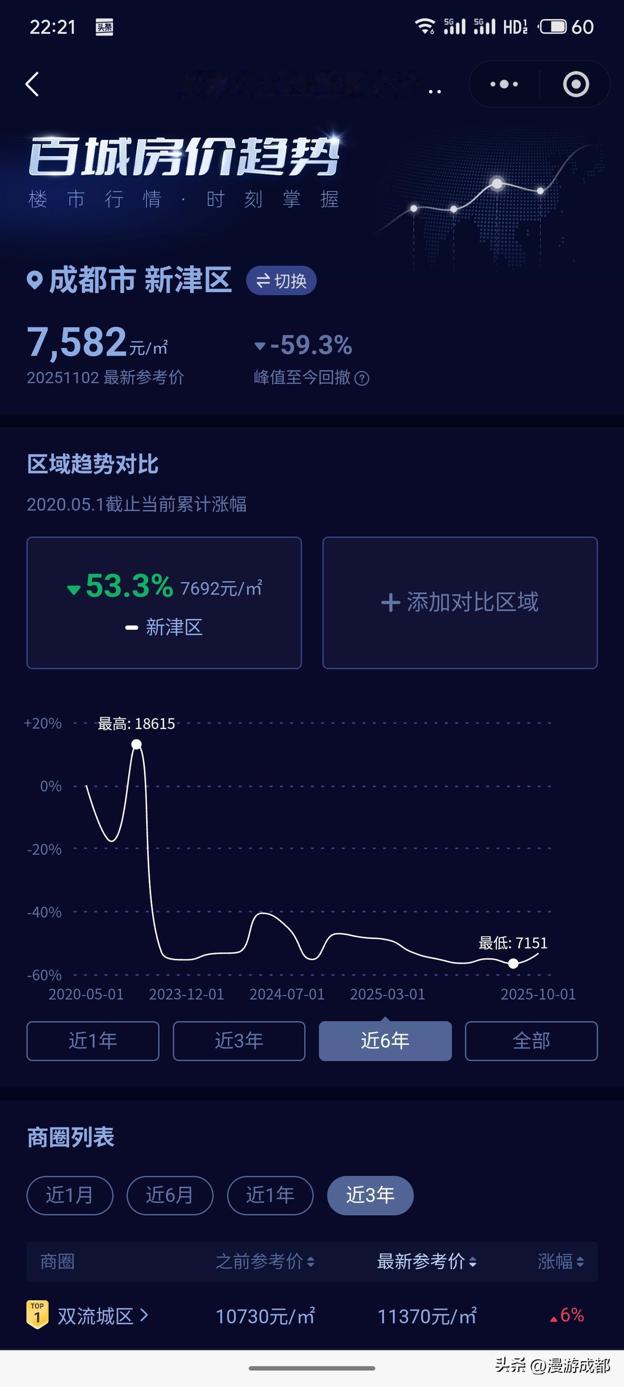 成都新津和天府新区的房子跌的这么惨吗? 近一个月新津房价跌了19.7%,近一年跌了42.4%,近三年跌了54.7%,成为成都房价跌的最惨的区! 而天府新区近一个月跌了15.3%,近半年跌了25.6%,说明近期在加速下跌了! 整体来看,成都平均房价已经跌回到2017年的水平了,最坚挺的还是主城区5+1! 现在有多少人买房亏了首付了,有多少人房价不抵贷款破发了啊?
