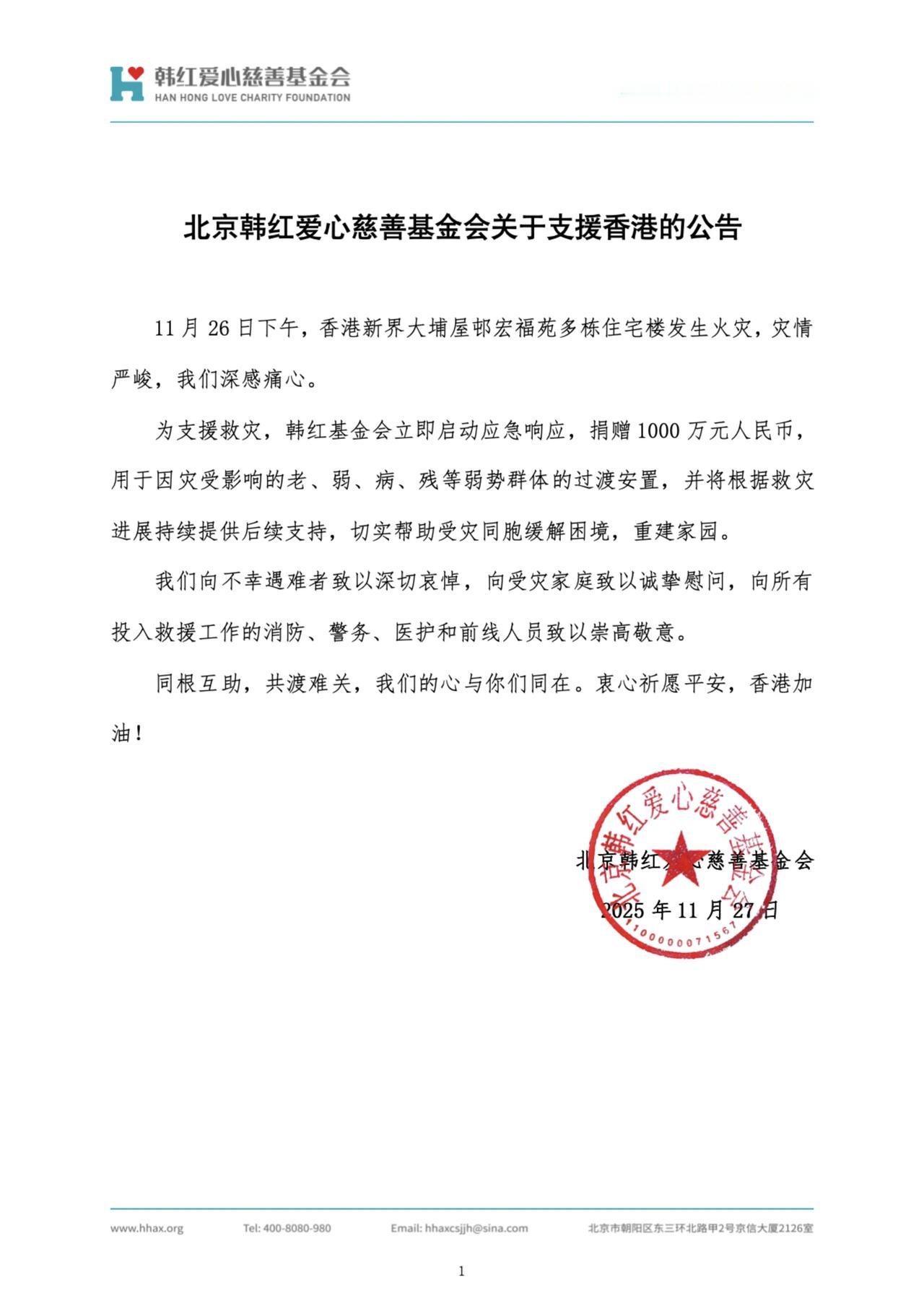 韩红基金会这1000万捐得太及时了! 看到韩红基金会最新消息,心里又暖又沉——香港大埔屋邨那场火灾太让人揪心了,那么多同胞受困,还有遇难的…… 而基金会专门盯着老弱病残这些最需要帮的人,给他们安置过渡,后续还会接着帮重建。这才是真正把钱用在刀刃上啊。 消防员、警察、医护们冲在前面拼命,遇难的同胞让人心疼,受灾的家庭更是难。但咱同根同源,有难一起扛,韩红基金会这波是真的在办实事,给所有伸手帮忙的人点个赞! 香港加油,愿平安早点回来!