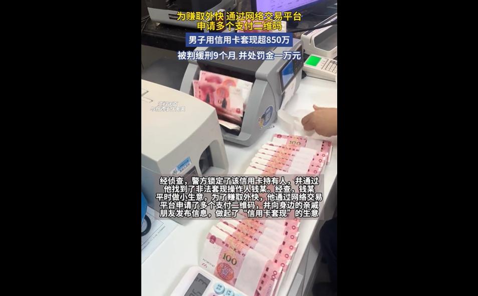 见过有人用信用卡套现,目的多样,有的是手中缺钱,不得已而为之。自然也有些就是另有目的,比如,见过有人用别人的信用卡套现,却坚决不还钱的。这就有些诈骗的味道了。 扬州市区某银行通过监管系统发现用户信用卡账户异常,线索移交公安后锁定非法套现操作人钱某。 钱某为赚外快,用多个支付二维码帮十位亲友套现 850 余万元并收取好处费,其行为已构成非法经营罪。 最终钱某被法院判处有期徒刑九个月,缓刑并处罚金一万元。 钱某这波操作真是 “聪明反被聪明误”! 想靠信用卡套现赚外快,以为帮亲友 “救急” 还能捞好处,殊不知 850 万的涉案金额,早已把自己推向违法边缘,最后缓刑加罚金,外快没赚到还留了案底,简直是 “捡芝麻丢西瓜”。 信用卡本是方便消费的信用工具,非法套现就像给金融秩序 “添乱”,既破坏规则又藏着风险。 那些找他套现的亲友也挺糊涂,以为是便捷借钱,实则跟着踩了法律红线。 检察机关的提醒可不是空话,别觉得 “套现不算大事”,法律面前没有 “擦边球” 可打。 想赚外快得走正途,用违法手段投机取巧,到头来只会像钱某一样,偷鸡不成蚀把米,得不偿失!
