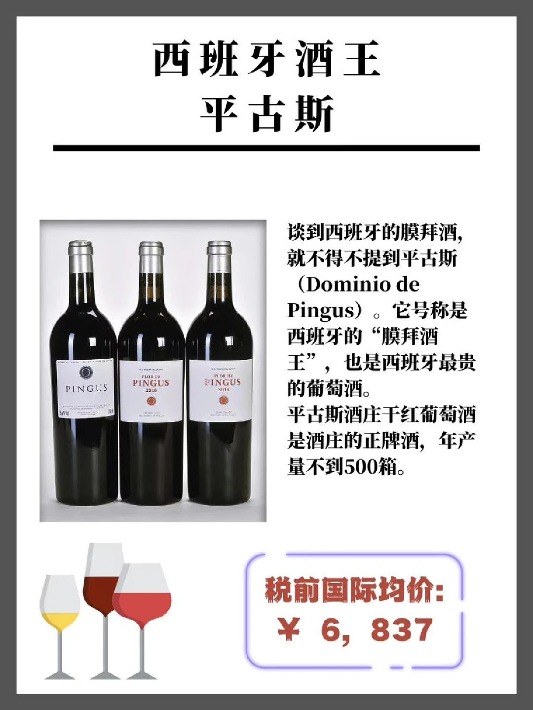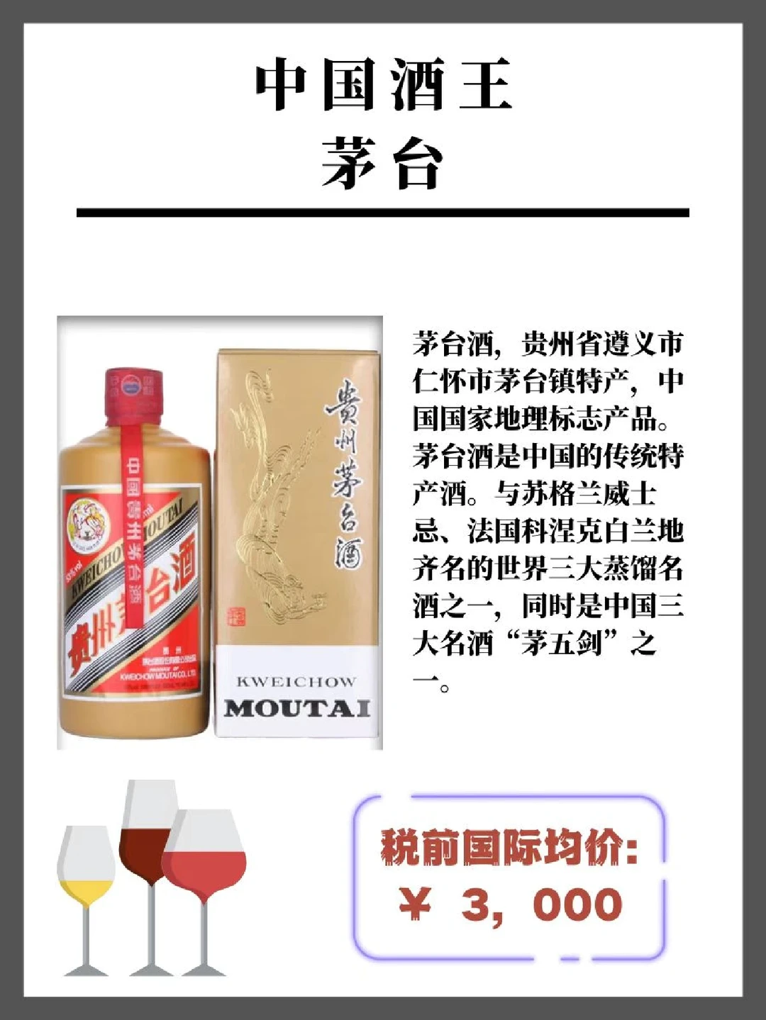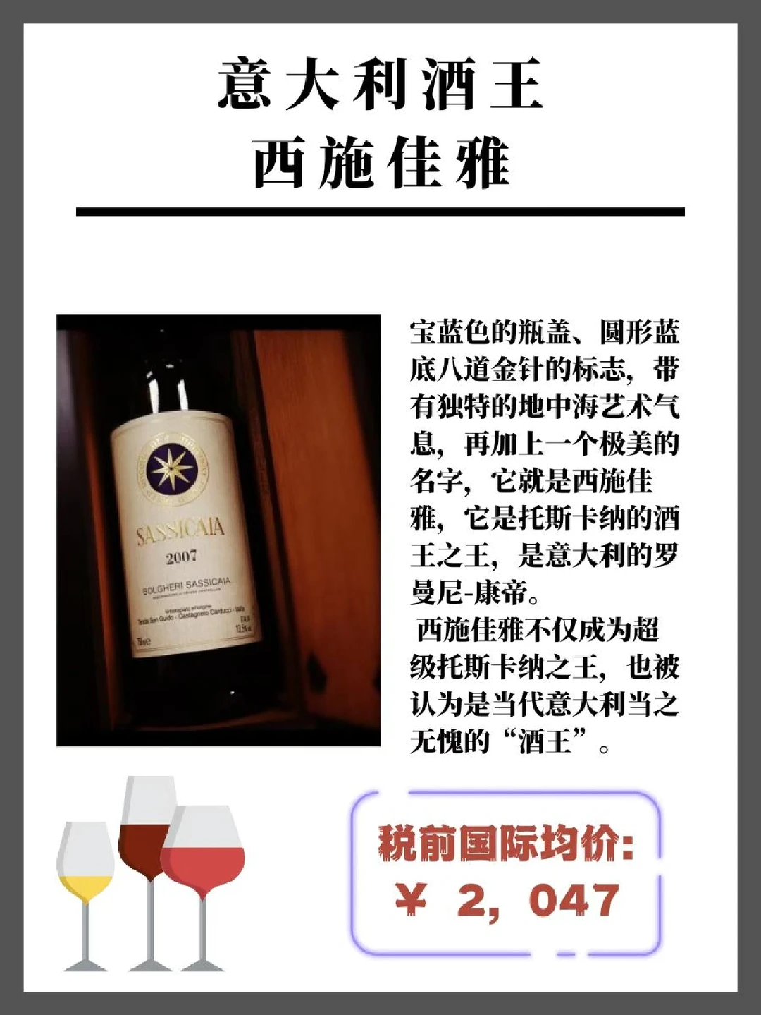 每一个经典的葡萄酒产酒国中,都有一个为公认的“酒王”。虽无正式的官方评比认证,每个酒王都有让你臣服的理由。今天就为大家来盘点下各国的酒王。 🇫🇷法国:罗曼尼•康帝DRC 💫法国有十大葡萄酒产区,最具知名度的就是波尔多与勃艮第。 💫勃艮第酒王则非罗曼尼-康帝(la romanee conti)莫属。它甚至被誉为王中之王,世界酒王 🇮🇹意大利:西施佳雅Sassicaia 西施佳雅是意大利“四雅”之首,它不仅是超级托斯卡纳之王,也是当代意大利当之无愧的“酒王”。 🇩🇪德国:伊贡穆勒Egon Muller 伊慕酒庄所产的雷司令有“德国雷司令之王”美誉,其中,沙兹堡逐粒精选葡萄干甜白葡萄酒(Scharzhofberger Riesling Trockenbeerenausles)是世界第一贵甜白,是名副其实的“德国酒王”。 🇪🇸西班牙:平古斯 作为世界上葡萄种植面积最大的国家,西班牙酒庄林立,风格迥异,但是说到“酒王”,却是众望所归:平古斯 🇺🇸美国:啸鹰Screaming Eagle Screaming Eagle的酒标非常有意义,是一只翱翔在葡萄园上空的雄鹰。Screaming Eagle是美国著名的空军中队,战史辉煌,从二次大战诺曼底战役到科威特战争,赫赫有名。 🇨🇱智利:活灵魂(Almaviva) 💫作品一号获得成功之后,男爵再接再励,决心将杰作再度复制,活灵魂由此而来。 💫“酒王”名字来自于法国著名喜剧作家博马舍《费加洛婚礼》中的人物“阿玛维瓦公爵”(count of almaviva),酒标图案则采用智利古代象征宇宙天地的图腾。 🇦🇺澳大利亚:奔富葛兰许(Penfolds Grange) 葛兰许采用不同产区的西拉、赤霞珠混酿而成,口感浓郁香醇,同时有着令人惊叹的平衡,获得了世界著名评酒家罗伯特•帕克高度赞许,毫无争议地成为澳大利亚“酒王”。 🇨🇳中国:茅台Mao Tai 茅台酒,贵州省遵义市仁怀市茅台镇特产,中国国家地理标志产品。茅台酒是中国的传统特产酒。与苏格兰威士忌、法国科涅克白兰地齐名的世界三大蒸馏名酒之一,同时是中国三大名酒“茅五剑”之一。 🎉关注我带你了解更多葡萄酒知识
