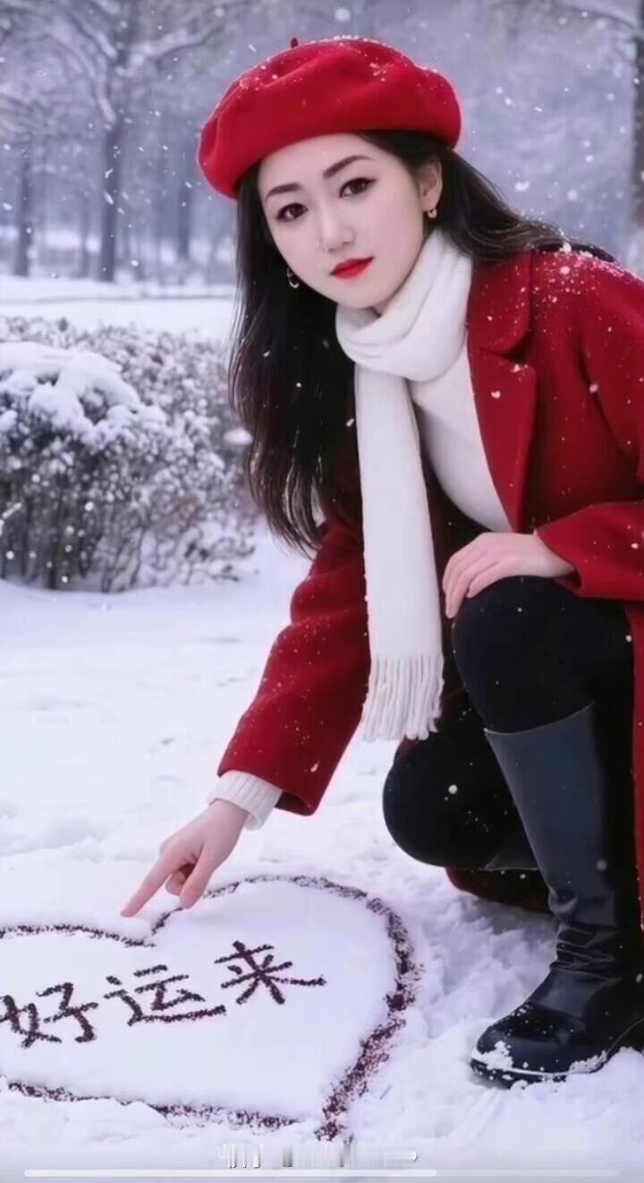 冬日雪景中的浪漫时刻,红衣少女与雪地心形的邂逅。
