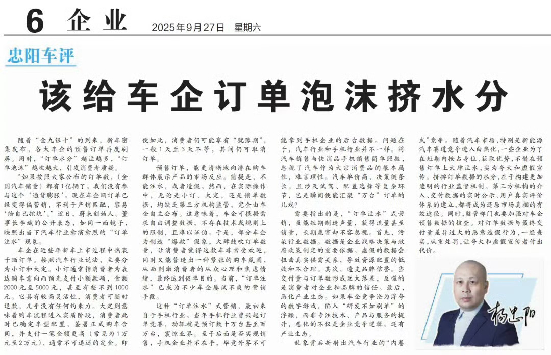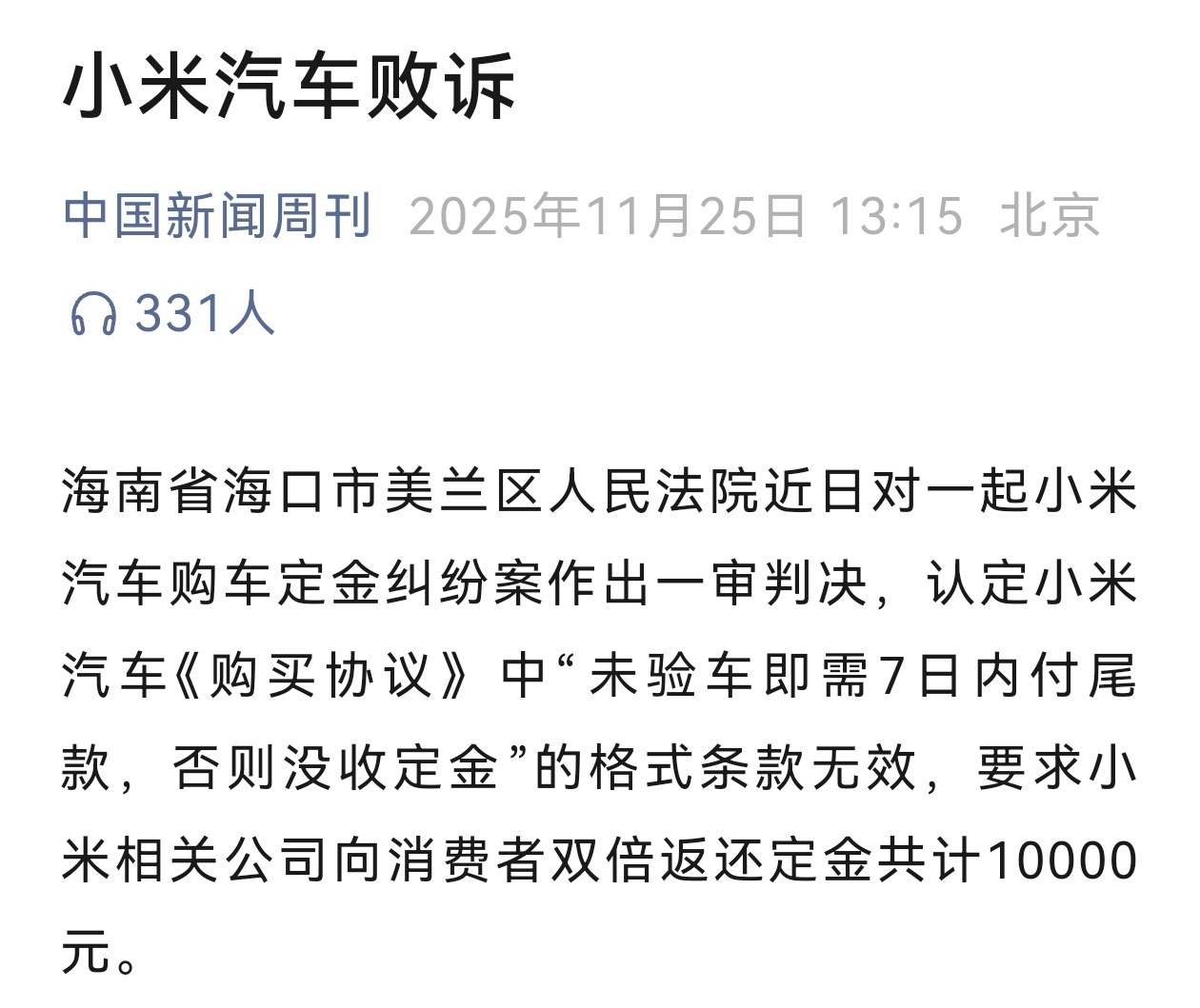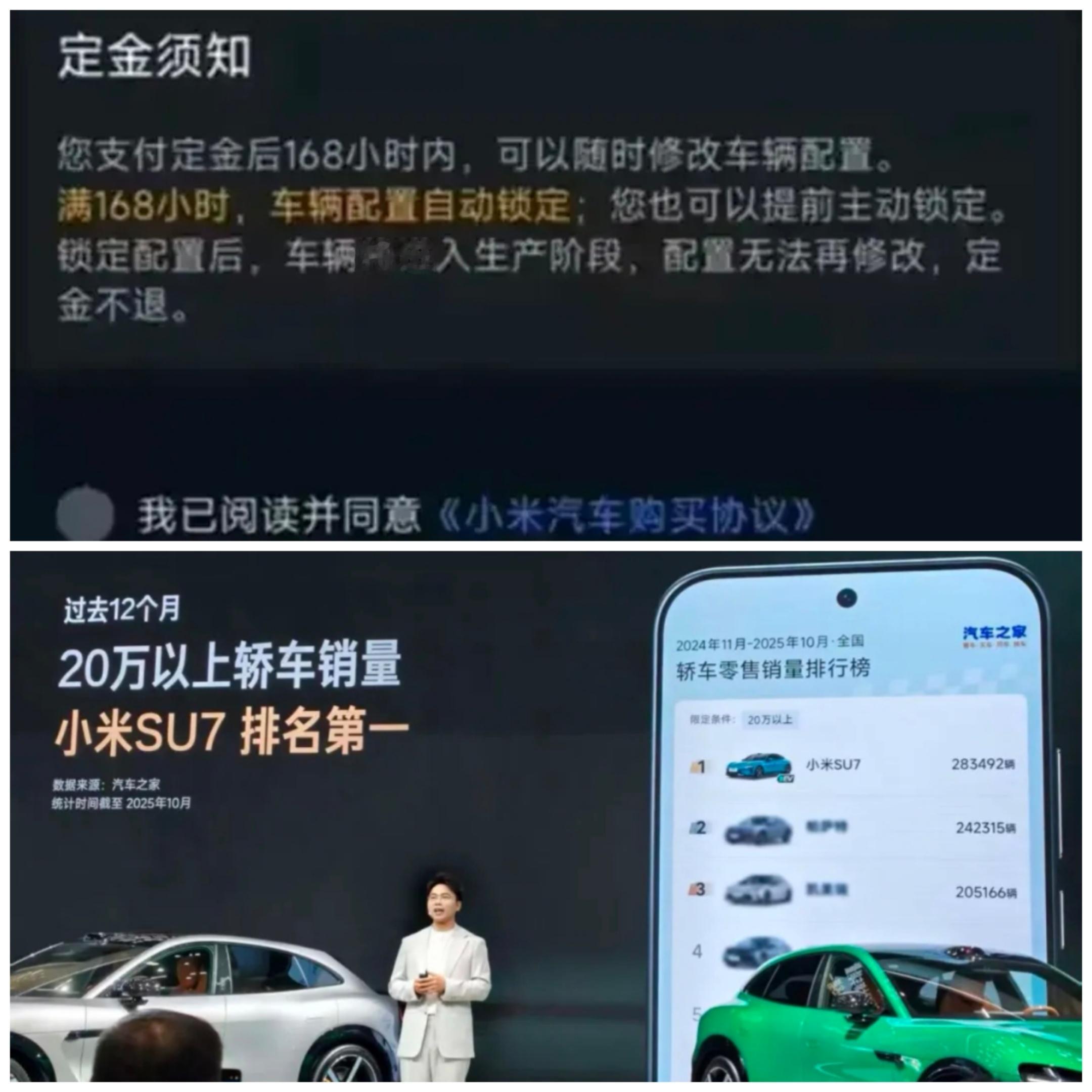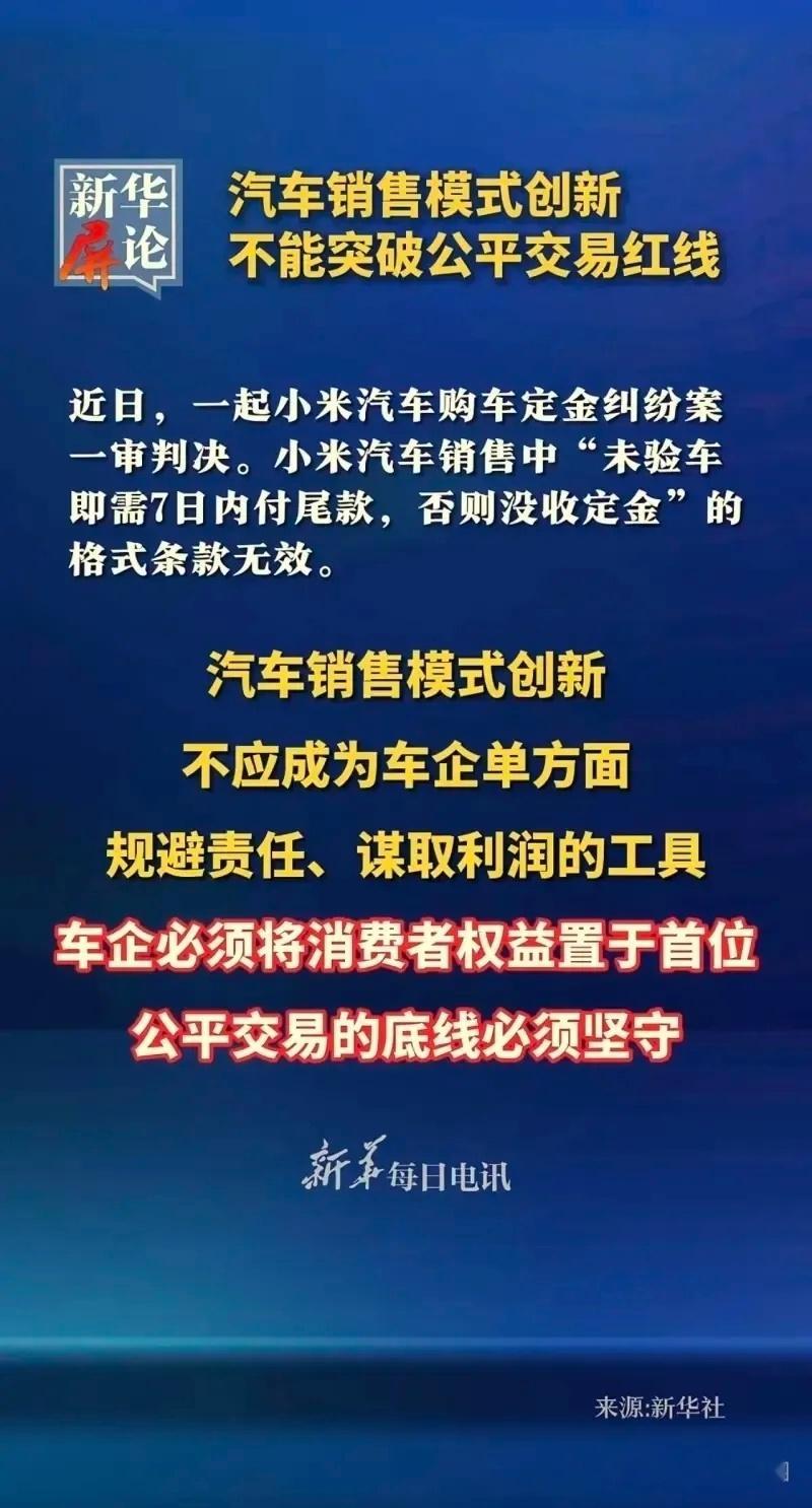 近日,小米汽车购车定金纠纷案一审宣判,法院认定小米汽车《购买协议》中“未验车即需7日内付尾款,否则没收定金”的格式条款无效,要求小米相关公司向消费者双倍返还定金共计10000元。这起全国首例针对小米汽车“未交车催收尾款”的司法判例,为汽车销售“先订后产”新模式划下明确的法治红线。满谈汽车满谈营销今年8月以来,全国多个YU7、SU7、SU7 Ultra车主,都发生车辆未下线就被催7天内付清尾款的情况。近年来,汽车行业兴起的预售模式,滋生出数据泡沫乱象,更引发各种消费纠纷,预售模式成了部分车企盲目追求订单数字的营销噱头。11月21日,广州车展媒体日,小米汽车副总裁李肖爽没有直接对比友商,而是用各种榜单凸显“小米第一”。11月26日,新华社主管主办的《新华每日电讯》发表题为《汽车销售模式创新,不能突破公平交易红线》的评论明确指出,汽车销售模式创新,不应成为车企单方面规避责任、谋取利润的工具。“先订后产”“大定锁单”等创新销售模式,需建立在尊重消费者、平衡权责基础上,短期营销红利不能透支品牌声誉,更不能践踏法律红线。今年9月27日,《经济日报》发表的社论文章《该给车企订单泡沫挤水分》曾指出,如今各大车企“订单水分”越注越多,“订单泡沫”越吹越大,此类订单注水的营销手段,最初来自于手机行业,但是汽车是大宗商品,岂是瞬间便能汇聚“万台”订单的儿戏。订单数据能让消费者了解一款新车的市场受欢迎程度,随着汽车行业竞争加剧,越来越多的车企为了营造出产品的火爆,开始在订单上“动小心思”,还衍生出“小订”“大定”概念。不管是小订、大定还是锁单数据,目前都没有第三方机构来监管,完全由车企自己说了算,车企可以根据自己的需求随意调整数据,反正也没有技术或者规则来限制,外界还很难去核实真假,针对订单造假行为的法律追责,更难以落实。