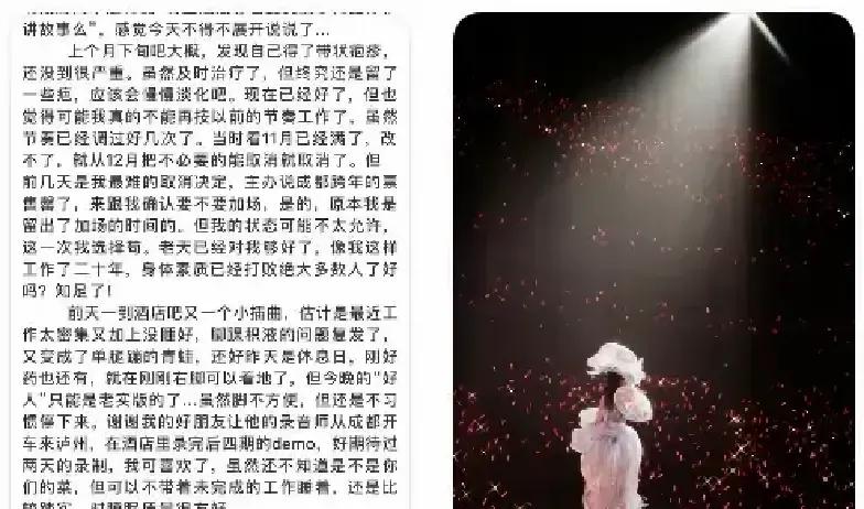 张靓颖在微博说脚踝积液又犯了,12月不折腾,连家门口的成都跨年加场也砍了。 她先道歉,说11月合同早锁死只能硬扛,12月再跑就是拿拐杖上台,不想给观众看瘸腿秀。 评论区一水儿“姐别硬撑”,主办方麻溜退票,粉丝把“健康第一”刷成屏保。 我看她这回是真怕了,以前脚肿还穿高跟鞋唱高音,现在直接躺平,连商演都砍,明显被医生吓唬过。 年底演出票价比春运,她肯把到手的钱推回去,说明身体警报已经红灯狂闪,再拼就要坐轮椅开演唱会。 艺人别等累报废才想起自己是肉做的,早点喊停比硬撑塌房强。