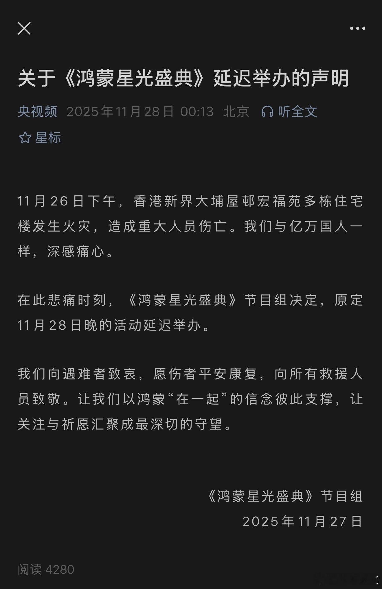 明天去深圳的飞机✈️我已经取消值机了!鸿蒙星光盛典的延期,是文娱界对香港大埔火灾灾情的深切共情,更是对生命至上的敬畏与担当。同胞同心!共渡难关!希望伤亡人数别再增加 央视鸿蒙星光盛典