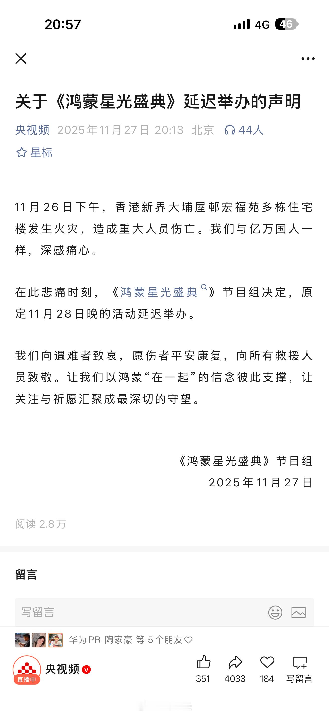 在此悲痛时刻,《鸿蒙星光盛典》节目组决定,原定11月28日晚的活动延迟举办。做得很对!鸿蒙,在一起!
