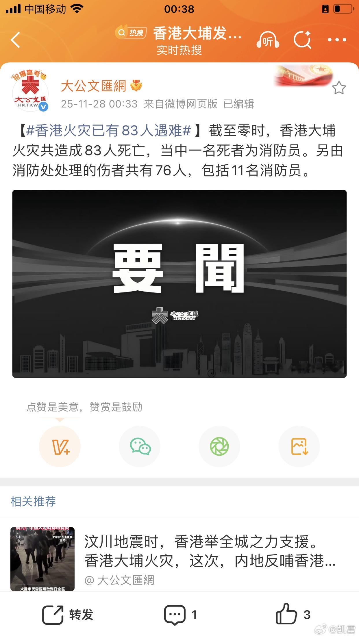 香港火灾已有83人遇难 【香港火灾救援最新消息】据央视消息:①截至11月27日22时,香港新界大埔火灾已造成75人遇难,另有76人受伤。②香港特区政府已经开放了9个庇护中心。③火灾现场已只有零星明火。④消防员已成功拯救了55人。⑤香港特区政府今晚即时向灾民派发每户1万港元应急补助金。⑥香港特区政府已安排巡查所有正在进行大型维修的屋苑,检视脚手架及建筑物料的安全。