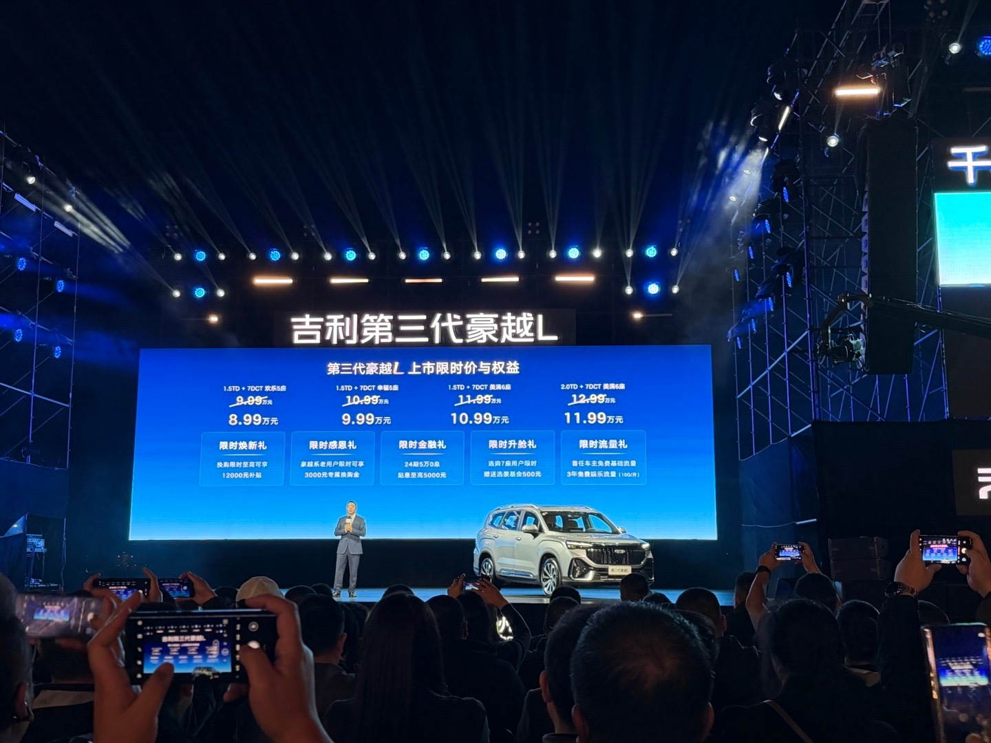 吉利第三代豪越L今晚上市,新车共推出 4 款版型,官方指导价为 9.99 万元到 12.99 万元。为回馈用户,即日起至 12 月 31 日下订,可享受 1000 元订金抵 11000 元购车款的优惠,上市限时价低至 8.99 万元起。祝大麦大麦