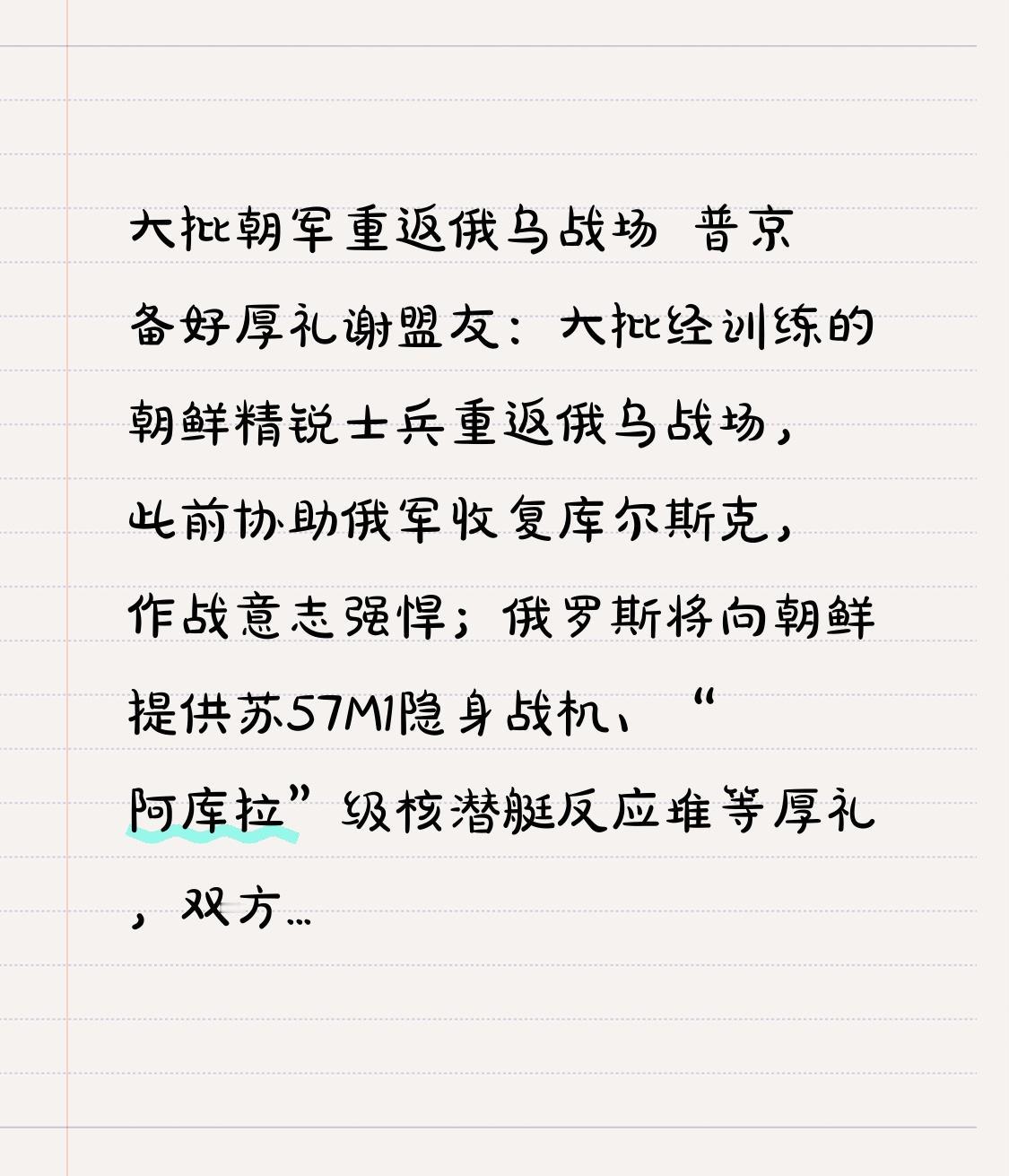 大批朝军重返俄乌战场 普京备好厚礼谢盟友:大批经训练的朝鲜精锐士兵重返俄乌战场,此前协助俄军收复库尔斯克,作战意志强悍;俄罗斯将向朝鲜提供苏57M1隐身战机、“阿库拉”级核潜艇反应堆等厚礼,双方依《全面战略伙伴关系条约》合作。