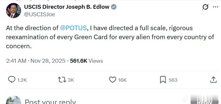 美国公民及移民服务局长约瑟夫·埃德洛:按照特朗普总统的指示,我已下令对所有来自各个关注国家的外国人的绿卡进行全面、严格的重新审查。