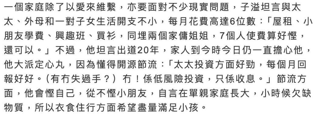 杨怡一家每月生活开销六位数,房租6万还雇了俩家佣,丈夫养全家 罗子溢结婚了,和杨茜尧,大家知道吗,他们有两个小孩,一家人热闹的,人一多,开销就大。 罗子溢是演员,拍戏挣钱的,不过光拍戏不够,还要做别的,比如商演,登台唱歌,拍广告,都得干,为了多挣点,没办法的事。 他们家开销挺大的,房租要交,给的佣人要开工资,小孩上学,还要报兴趣班,这都是钱,固定要花的,还得买衣服,不过他们自己省,省下来给家里用。 一个月要花好多钱,六位数吧,可能还要多,罗子溢自己也说,压力有,娱乐圈收入不稳的,得拼命干,多挣点才行。 他们住西贡浅水湾的独立屋,租的,一个月要六万港币,为了七口人住,只能租大点的,西贡浅水湾还算方便,离工作的地方也不远,租金也能接受,选来选去,就这儿了。 小孩上学得花钱,想让他们上好学校,学费贵,还得上兴趣班,学点东西,一年下来,不少钱,罗子溢小时候过的苦,单亲家庭长大的,不想让小孩也这样,所以尽力给他们好的。 杨茜尧也厉害,会理财,每个月投资能赚点钱,补贴家用,她现在主要带小孩,很少拍戏了,家里的事,她管的多,罗子溢负责挣钱,夫妻俩分工合作。 大家以为香港演员都很有钱,其实不是这样的,就算罗子溢,杨茜尧这样的,也不是随便花钱的,TVB演员片酬不高的,得靠别的挣钱,竞争很激烈的。 很多人看完这个故事,都会去想,艺人也不容易啊,他们也在努力生活,为了家人,拼命工作,开源节流,想给家人更好的,跟普通人一样。