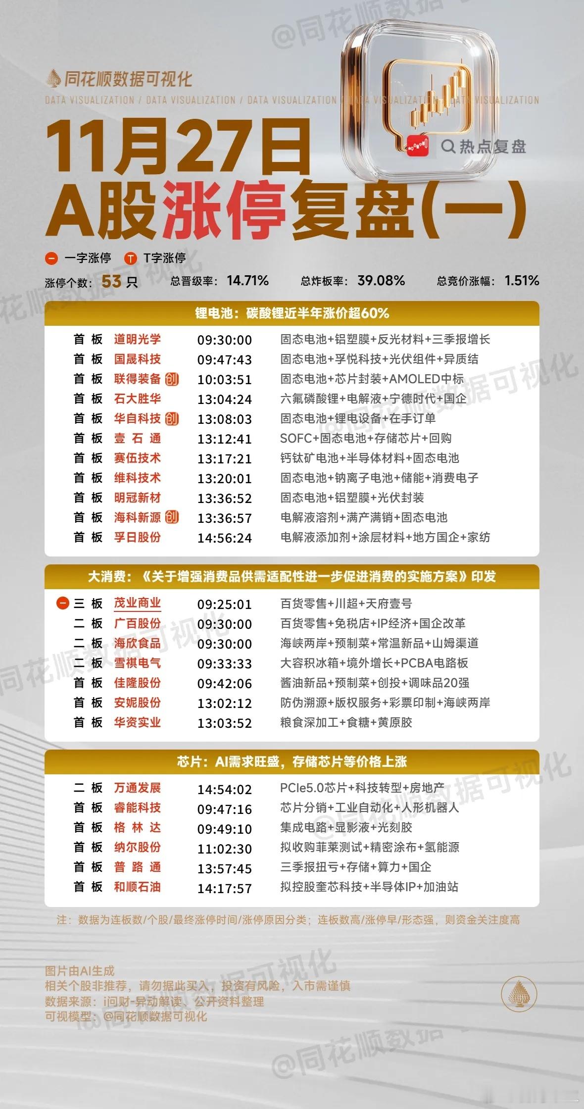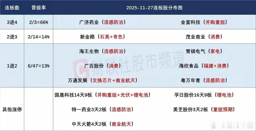 11月28日盘前预案:短线接力崩塌式重创,混沌期更要注意防守!1、昨天的市场整体并不差,但是连续三个交易日走出了冲高跳水的走势,量能继续萎缩,两市成交额已经只有1.7万亿,这样的量能是很难支撑多个题材的,所以昨天的市场整体是比较混乱的,实达莫名其妙的负反馈带崩了整个短线情绪,特别是AI应用方向的高标集体兑现,这样的行情下,整个短线接力就非常有难度,那么多看少动可能会更好一些!2、两只4板个股金富是弱转强一字晋级,这只个股可能会像梦天一样是资金过渡的产物,所以在短线情绪差时它反而走出了强势一字板,但是这毕竟是只明显的微盘股,而且没有板块支撑,谨慎的话还是回避比较好,但是这只个股的表现可以当成短线的情绪,毕竟它晋级4板走出了超强表现,隔日继续一字的话,对于整个短线情绪会有明显带动!广济竞价偏差的情况下开盘依然有资金引导上板,但是很快还是被短线情绪带崩,好在流感方向很快走出反转走势,广济跟随走出强势回封就非常不错了,这样的话,隔日就有弱转强的预期,而且它和金富是存在竞争关系的,如果它竞价能超预期表现,甚至可以卡位金富上位,毕竟同身位换手板会明显更受资金青睐,而且广济不论板块还是热度都要远高于金富,所以它竞价有明显超预期转强是非常值得关注的!3、茂业大单一字的表现并没有带动整个零售方向走出强势表现,只有一只广百跟随晋级,其余多数个股走出了冲高回落,人气标的东百最为伤人,但是它竞价确实不如广百,人气终究顶不上资金的选择,所以有的时候选择个股不能只看辨识度和弱转强,而要看同身位资金的认可度,从昨天竞价的表现看,毫无疑问同身位的广百就是要强于东百,如果短线情绪好,那么大家一起晋级,反之,一旦情绪差,分歧更大的就更容易兑现,特别是茂业只高一个身位的情况下,板块不是足够强势的情况下,接力确实要慎重!昨天零售大分歧,今天茂业早盘的表现就极具看点了,它昨天受板块影响是较弱的,所以它的分歧就更值得关注了,毕竟中水有过类似表现,2进3的时候走出了一个高开秒板后板上分歧承接晋级,而茂业开盘能不能强承接上板对于整个零售方向的修复非常重要,如果它开盘足够强,那么整个零售方向或许会走出共振走强,昨天炸板的人气股东百或许会有修复反包的机会!4、锂电方向再次走出了强势表现,国晟竞价弱转强大幅高开反包晋级,走出了14天9板的表现,它二波的表现确实走的够有特色,高位的2+1还是缩量晋级,隔日不开一字板的话抛压就会非常大,它能不能顶住压力走出一个放量承接换手板值得关注!道明是锂电叠加消费电子概念个股,它同样是高开秒板的走势,而且在前一天有过明显试盘冲板动作,只不过出现了回落,它双重属性是加分项,隔日竞价和国晟明显会是PK关系,这两只个股都是可能走出来的首板,也许竞价谁更强,资金就会选择谁,但是能不能一起晋级,就看板块能否持续了,相比于道明来说,国晟获利盘更多,抛压会更大!5、海峡方向因为实达的负反馈,高位股都是明显杀跌,海欣走出了一个缩量T字板晋级非常强势,再加上大消费这一块一般会轮动,所以它继续走出持续性的概率非常大,一旦它走出强势一字板,对于整个海峡方向的修复肯定会有促进!福日是海峡叠加消费电子,这只个股在8月份跟随机器人走出了一波强势表现,之后持续走弱,是时隔3个多月后再次走出首板,昨天消费电子有明显异动,它和道明是最强的两只个股,而它海峡概念是加分项,所以它的辨识度明显更高,所以它竞价的表现就非常值得关注了,如果真的强,会是一个高开上板的走势,但是考虑到它近期有过明显深跌,那么抛压肯定不小,所以它能不能在板上很好的承接晋级更值得关注!安妮是海峡叠加AI方向的个股,它是早盘充分洗盘后的直线拉板,整个AI方向昨天是大的负反馈,一旦今天有所修复,它就很可能会是那个明牌补涨了,而且隔日一个高开就破前高,连续4个交易日洗盘充分的情况下,一旦竞价出现非常强势的表现,它晋级的概率还是比较值得期待的!6、昨天短线高标情绪崩溃时,市场其实给我们指明了方向,那就是前期即将退潮的妖股走出了亮眼表现,合富平潭都是有明显冲高表现,这是资金没有方向的情况下的选择,但是如果短线情绪修复,这些个股反而容易继续退潮,所以接力要更谨慎一些!昨天小胖被实达暴击,特发虽然大肉出局,海药和雷科都是大幅亏损,再加上接力东百的大面,心情确实受到了影响,复盘情绪不对,所以就偷懒休息了一下,望见谅,在这个市场每个人都会有绝对的低谷,小胖也不例外,这个月出现过两次了,但是毕竟市场就是这样,适者生存,而我们能做的就是调整好心态,找出自己的不足,进步多一分,你就会更加强大!文中的内容仅为分享和交流,不作为实际操作建议!