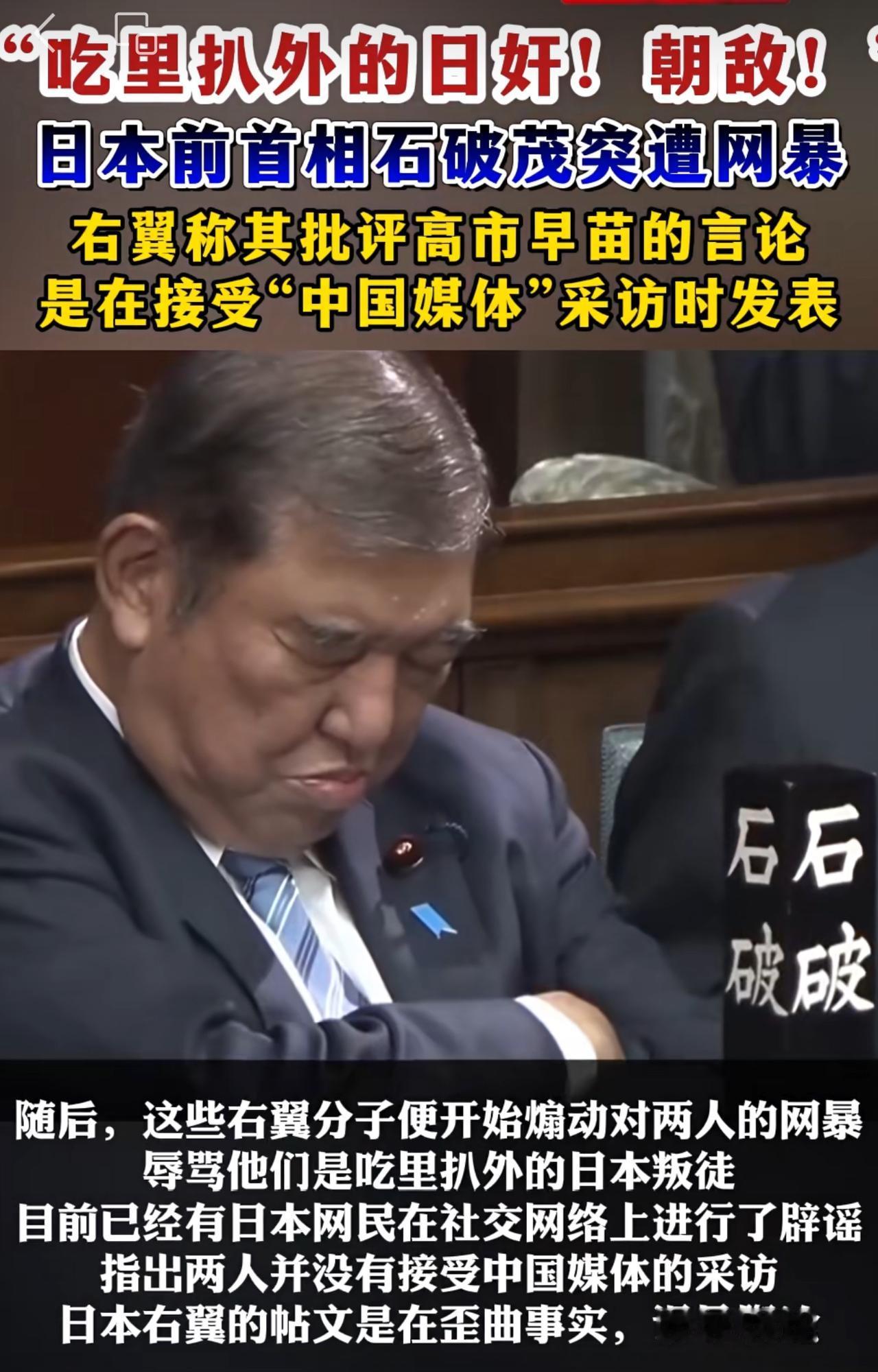 石破茂是吃里扒外的汉奸:当下石破茂在日本国内遭受网暴! 日本右翼势力多么猖狂,他们开始疯狂攻击日本前首相石破茂,就是因为石破茂接受采访说了,日本应该与中国搞好关系,现在日本右翼网暴石破茂是汉奸! 高市早苗已经被日本民粹绑架,特别是这些右翼非常嚣张,他们一直蓄谋对我国再次发动一场战争,我们一定要提高警惕!