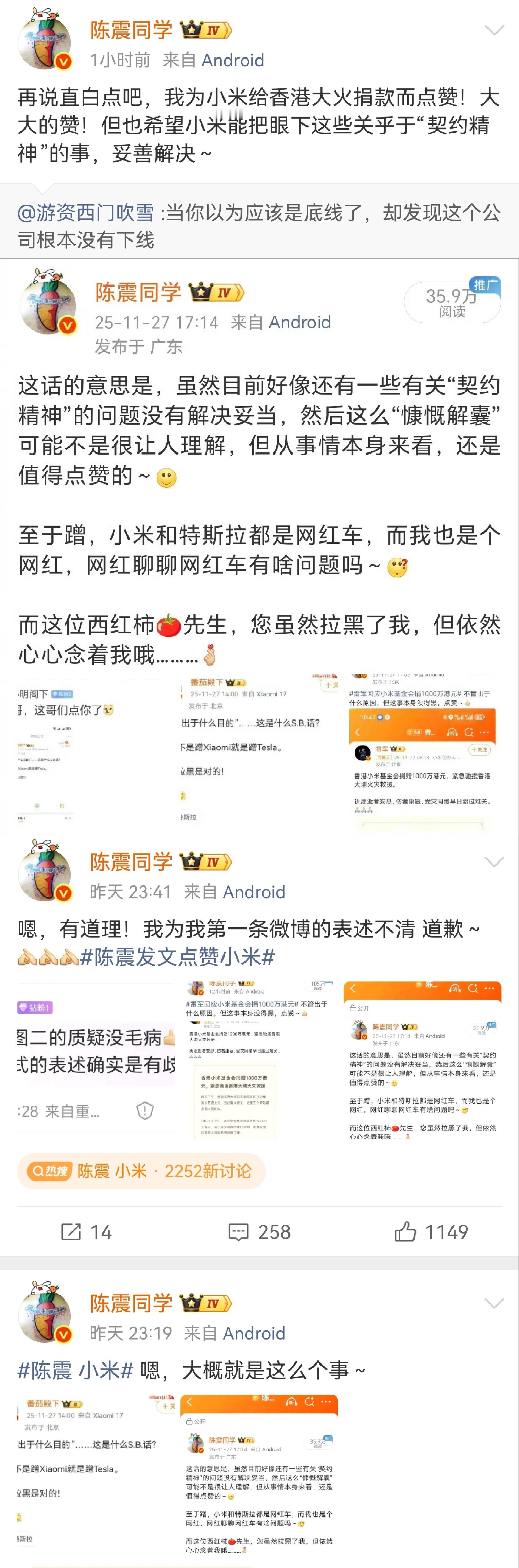 感觉陈震特别“关心”小米和特斯拉,蔚来、小鹏、鸿蒙智行等车企,也有其他问题,怎么就得不到同样的待遇?流量是双刃剑,真担心陈震哪天出席线下活动,遭到冲动上头的网友殴打,建议配个保镖吧,真心建议。退一万步说,不管出于什么原因,但这事本身挺招黑,祝陈震平安。