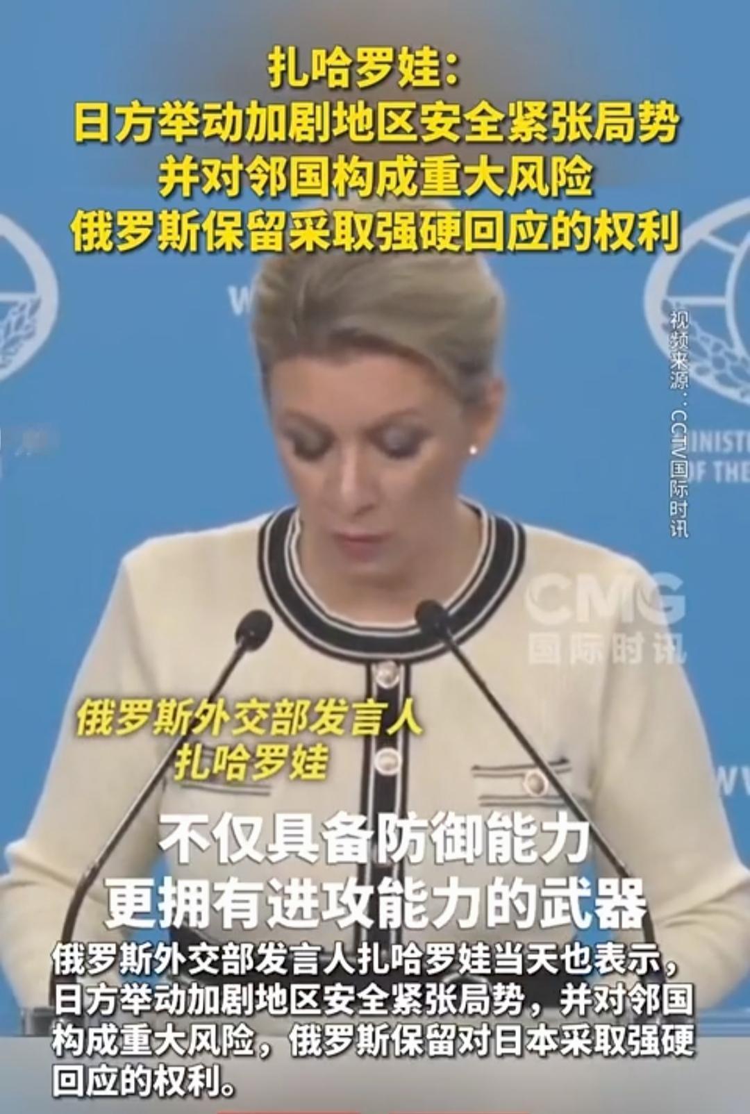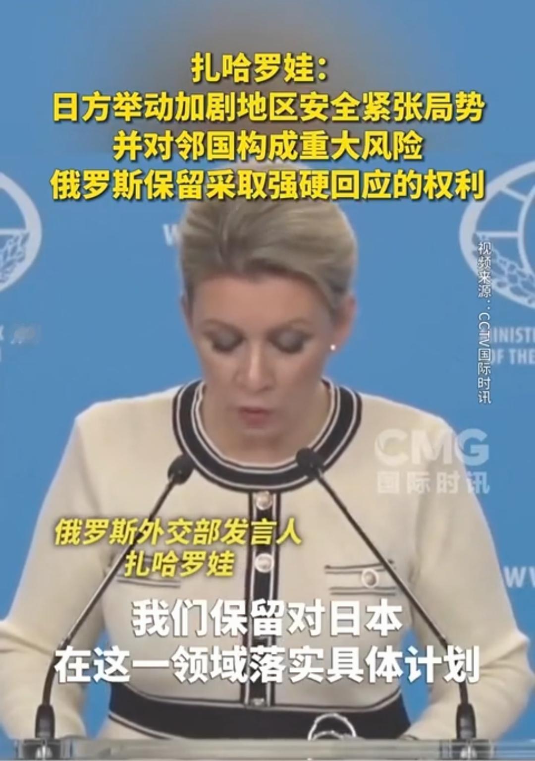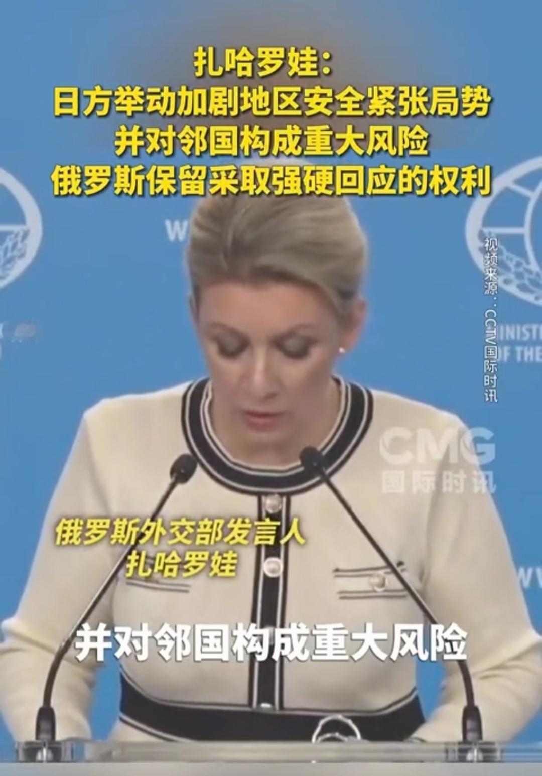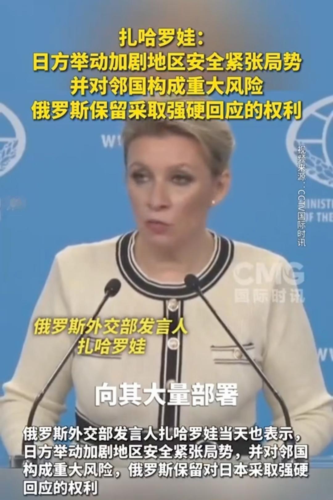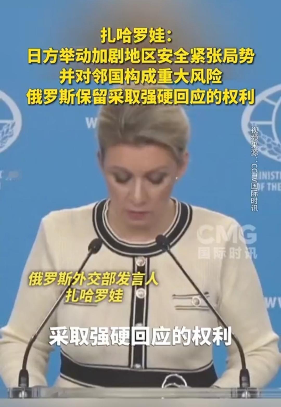 中国若有事,就是俄罗斯有事。俄罗斯外交部发言人的表态让日本胆战心惊! 随着日本在危险的道路上越走越远,中国态度越来越严厉,俄罗斯也表了态。 俄罗斯外交部发言人扎哈罗娃表示,日方举动加剧地区安全紧张局势,并对邻国构成重大风险,俄罗斯保留对日本采取强硬回应的权利。 言外之意,若日本对中国构成侵略,俄罗斯有可能对日本采取强硬措施。 日前,解放军在台海及周边海域开展常态化战备巡航,重点强化对西南方向海空态势的监控,以实际行动回应日方挑衅。 ​ 而俄罗斯远东军区也提升战备等级,在南千岛群岛(日称北方四岛)附近举行联合军演,明确针对日本的军事部署调整。
