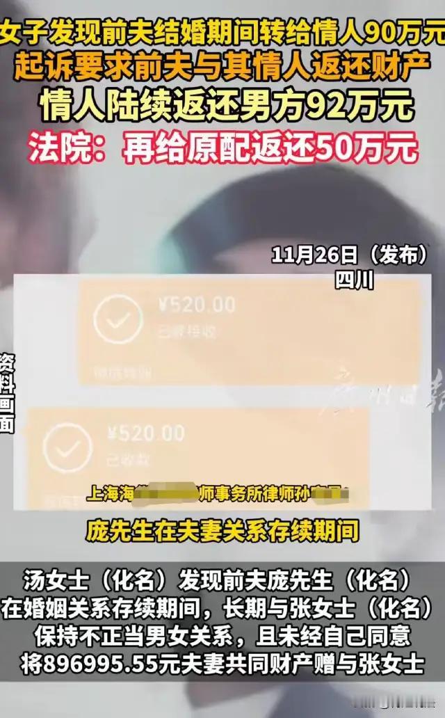 四川达州这场离婚后遗留的“财产大战”,让人不禁感叹现代婚姻的复杂与情感纠葛的 “钱” 字难解。汤女士在剥离婚姻的痛苦之后,发现前夫庞先生竟然背着她将近90万元的夫妻共同财产转给了情人张女士,这不仅是对过去婚姻的背叛,更触及了法律和财产的底线。 汤女士愤而将前夫和张女士告上法庭,要求认定那笔“赠与”无效并追回属于自己的财产。更戏剧的是,张女士事后陆续给庞先生转账超过92万元,试图弥补所谓的“损失”,以为能洗清责任、关闭这场纷争。但法院的判决却令她大吃一惊:她还得再给汤女士还51万元。 这起案件不仅仅是一场金钱纠纷那么简单,它映射出人性里最复杂的三个关键词:信任、背叛与代价。庞先生表面上是丈夫,可他却用金钱维系着另一段隐秘的关系,将共同财产私下转移;张女士或许曾一度以为自己掌握了主动权,实际上却成了这场三角关系中的“牺牲品”和“被套牢者”。 从法律的角度看,夫妻共同财产的保护不仅是对当事人权益的维护,更是一种社会公平与正义的体现。法院坚持认定赠与无效,意在澄清那条混淆视听的灰色界限,提醒所有人——婚姻关系中的财产不容侵犯,任何私自挪用都必须承担责任。 而作为旁观者的我们,则可以从这场纠纷中看到,人性的挣扎与选择,并引发深层思考:当婚姻破裂,如何理性面对财产的分割和情感的破碎?尤其是对于被背叛的一方,怎样才能在伤痛中找到一条法律与心灵的救赎之路? 汤女士觉得“买卖亏大了”,这话中有疼痛,也有无奈。但正是她敢于维权、敢于直面现实,才让正义得到伸张。这不仅是对她个人的胜利,更是对社会诚信和法律权威的有力捍卫。 婚姻分割财产 上海巨额离婚案