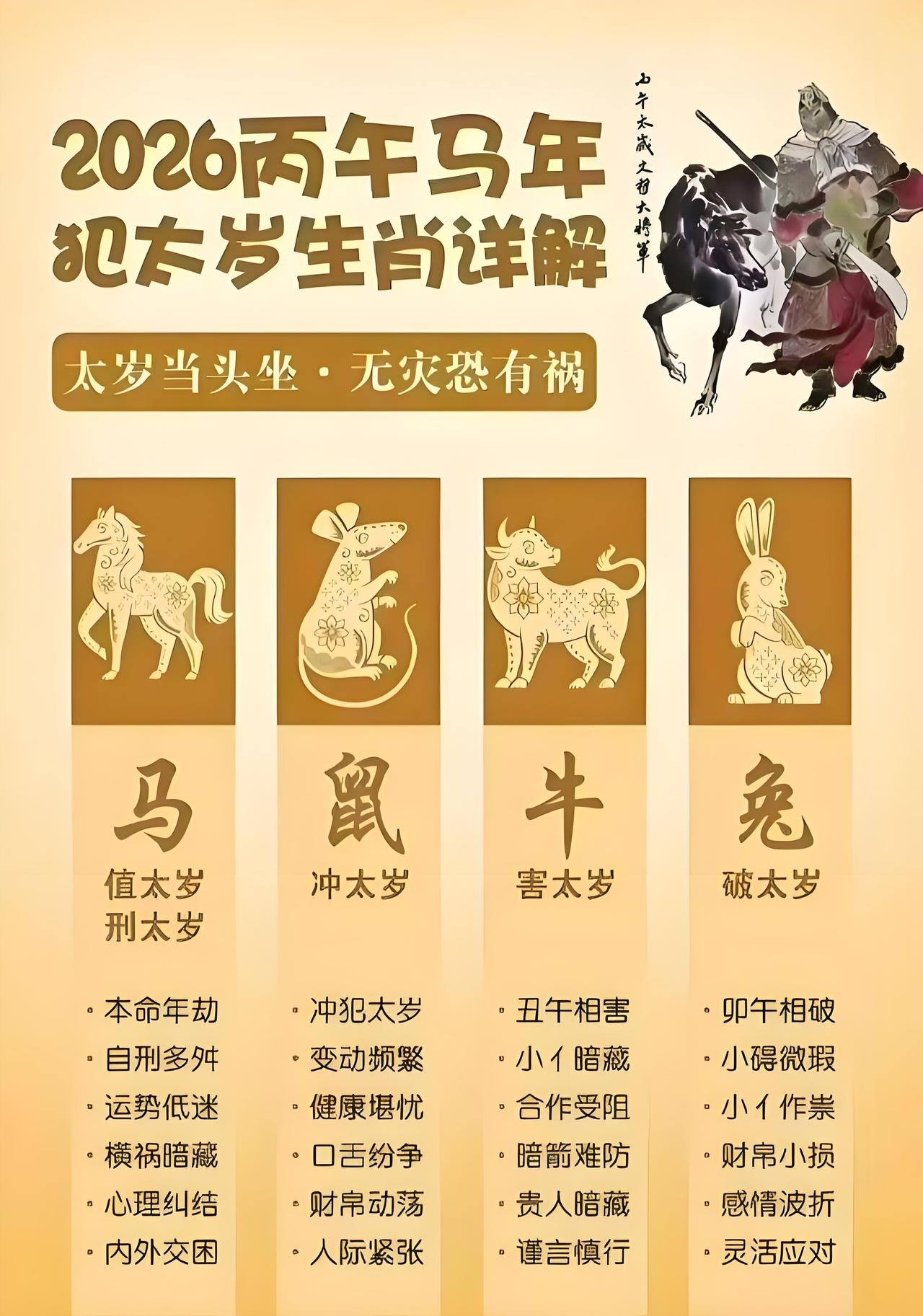 小孩子犯太岁,就怕感冒发烧多,容易磕碰擦伤,不听话,有虚症,梦游,会做出一些让父母惊讶的事情。 大人犯太岁,严重一些的,就怕官司是非病痛多,破财惹祸,轻微一些的,那就是工作感情不顺。 犯太岁不顺的前提,一定是自己当年的运气也不行。太岁这个词,实际上就是把一些事情给引出来但这个事不见得都是坏事,也有可能是好事。你的重心在哪里,就容易引出那些事 然后有几个比较需要注意的点,就是遇到害的年份,破的年份,实际上这种口舌,人际关系是会变复杂的,这种概率是高的,比如马年,牛跟兔子是害破的,所以这两个生肖在人际关系方面是容易稍显复杂的,当然有些会体现在自己的情绪状态上,很不稳定。这是可以去提前做一些心理建设跟预防的,虽不是什么大事,但是必须要注意。犯太岁 破太岁