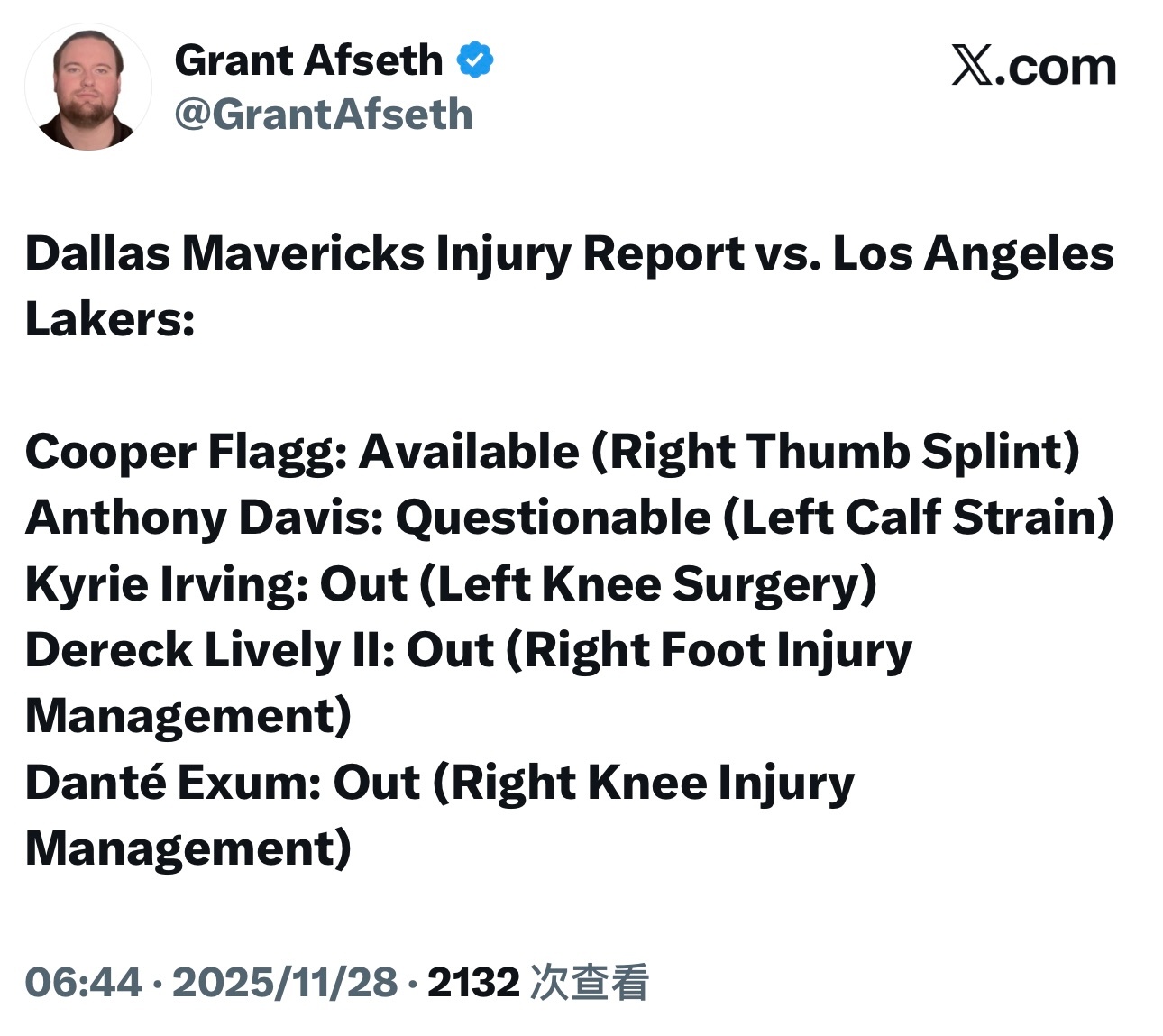 独行侠更新伤病情况:弗拉格可以出战,戴维斯出战成疑,欧文、莱夫利、艾克萨姆因伤缺阵。