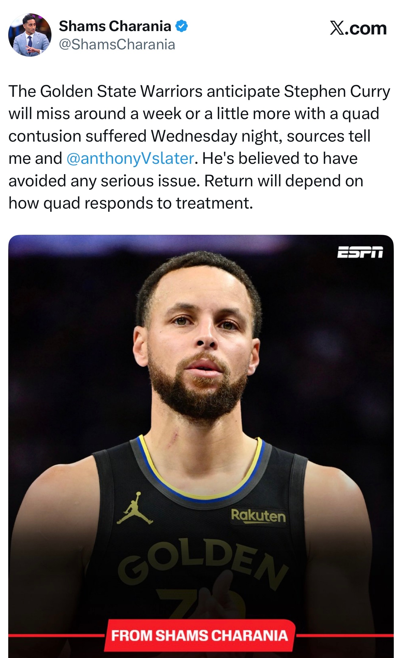 Shams:库里股四头肌挫伤,缺席一周左右,具体回归时间将取决于肌肉对治疗的反应情况。