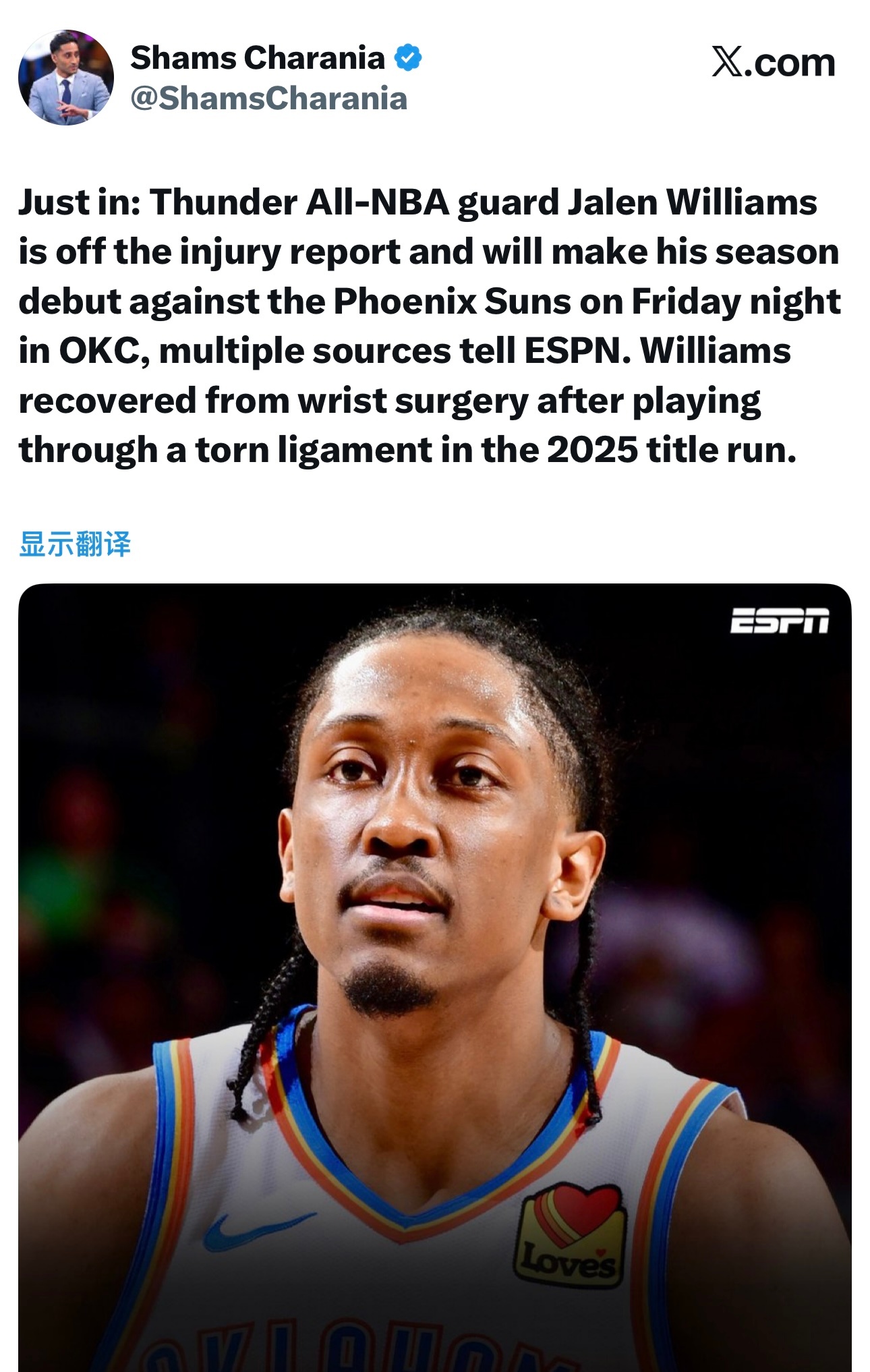 西部第一雷霆即将迎来完全体,杰伦·威廉姆斯明天对阵太阳迎自己赛季首秀。