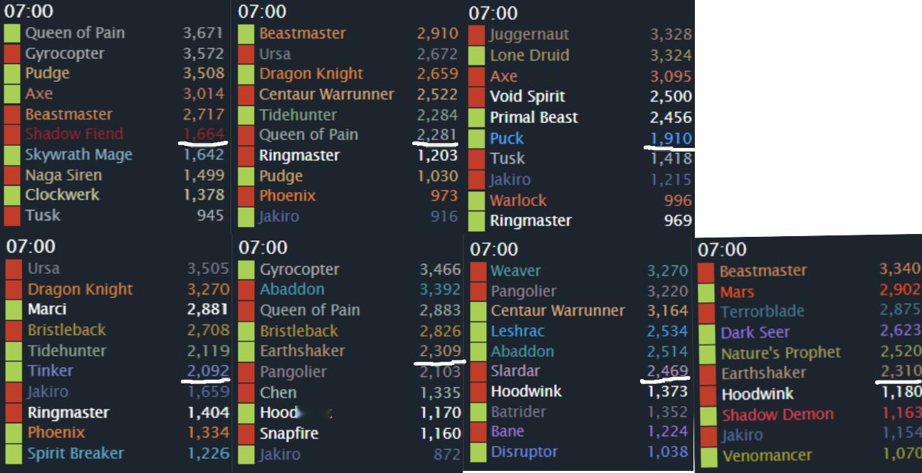 做了个XG7分钟对线经济统计,发现进祥的对线问题比想象中还要大...截至目前XG共打了7小局比赛,其中6把NTS都是老六经济,只有一把勉强到了老五但还是被对面中单压了近600,那把的老六是对面的三号位;NTS有2局在7分钟时经济甚至没达到2000,这在中单位置属于无解穷的存在;哥哥和xNova的优势路还算稳健,这7局比赛XG大哥的经济全部都比对位三号位更高;X哥前两天一直在被对面的双头龙爽喷坐大牢,昨天XG改变了BP思路开始自己抢双头龙后X哥的日子明显舒服起来了,打OG这把7分钟时的经济甚至是全场第一