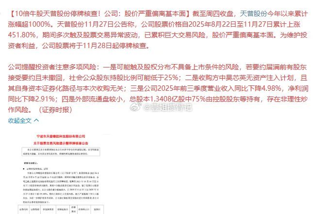 10倍大牛股天普股份停牌!昨天品茗科技预停牌,直接大跌12CM!天普股份昨天第二波3连板涨停被砸,晚上停牌核查。最近停牌,预停牌,不仅针对高标连板,现在高标趋势也纳入强JG兑现。品茗科技,天普股份都是趋势二波大涨。值得注意的是之前停牌,预停牌都针对的是涨停股,当日涨停股,现在当日下跌,上涨,次日都可能停牌。品茗科技昨天的预停牌,对高标连板,涨停股打击巨大,昨天连板指数全A跌幅榜第一,高标股,涨停股亏钱效应,空间板压缩至4板。今天10倍股天普股份停牌,雪上加霜,另一个20倍股上纬新材也要小心点。