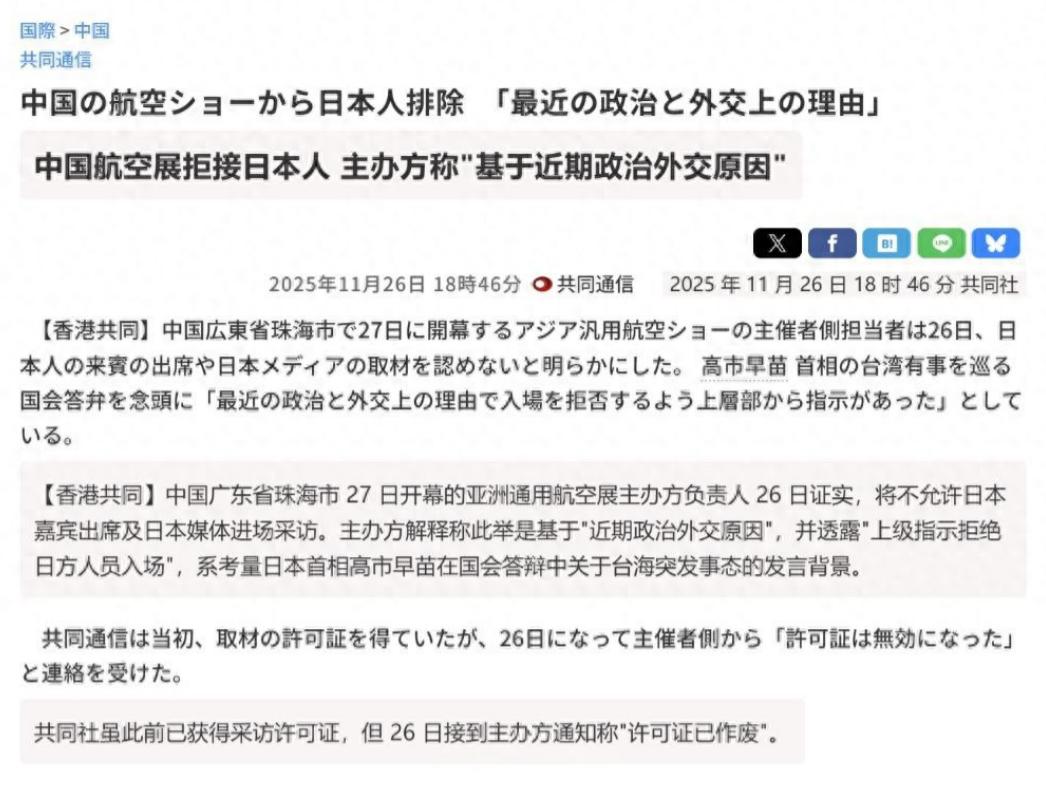 中国航展禁止日本相关人员入内,直接吊销许可证,引起外界高度关注。 11 月 26 号那天,日本共同社先放出了消息,说 2025 珠海亚洲通用航空展开幕前一天,他们手里的采访许可证说作废就作废了。 不只是媒体,日本那边的嘉宾也全被拒了,不管是提前登记好的还是已经拿到手续的,没一个能进去。有不少日本航空业内的人早就订好了机票酒店,就等着去现场,结果临门一脚被拒了,估计心里别提多窝火。 日本那边倒是先自己对上了号,说这事儿八成跟近期的涉台言论有关,特指的就是高市早苗那番话。 这话可不是随便说说的,之前她在国会里公然把 “台湾有事” 和日本的 “存亡危机事态” 绑在一起,这在日本法律里可不是空话,等于明着暗示可能要武力介入。 这种踩红线的话一出来,中方当时就没客气,严正交涉了好几次,现在航展这一手,算是把态度摆得更明白了。 这场航展本身分量可不轻,是珠海 “双航展” 格局里的重要一环,跟德国那边合作办的,吸引了全球 300 多家企业参展,室内外摆的飞机就有 150 多架。 放以前,日本企业不光来参展,甚至还派过 “蓝色冲击波” 飞行表演队亮相,怎么看都是挺重要的参与者。 可这次不一样,整个展馆里压根见不着日本面孔,参展商名单里从头摸到尾也没找着日本企业的名字,等于被彻底排除在外了。 主办方对这事儿的回应特别干脆,就说基于 “近期政治和外交上的原因”,是接到了上级指示,多一个字都没解释。 这种不拖泥带水的劲儿,其实比说一堆大道理都管用,明摆着就是没给任何讨价还价的余地。 有消息说这决定早就在筹备后期定下来了,特意等到开幕前才通知,就是怕日本那边搞游说干预,确保这禁令能实打实落地。 日本国内这会儿也吵翻了天,不少人都在骂高市早苗瞎折腾。前首相鸠山由纪夫直接说中日关系跌到了最糟的地步,国家利益亏大了,还引用老话让她赶紧认错。 日本中国友好协会更是直接发声明抗议,说那是 “把日本拖入战争的危险发言”。 连国际上都有不少批评声,俄罗斯说这是严重挑衅,韩国那边也说这是在给军国主义包装。 其实除了言论挑衅的原因,防谍的考量也藏在里头。日本在国际场合收集情报的前科不少,今年年初还在马六甲海峡演示过用雷达和红外相机收集情报的技巧,明着是民用演示,暗地里的心思谁都能琢磨出来。 这次珠海航展虽说主打通用航空和低空经济,展品多是民用,但里头有 381 家企业参展,少不了有军工背景的企业,就算是民间航空技术,也藏着不少门道,自然得多留个心眼。 高市早苗后来在国会辩论里倒是松了点口,说 “存亡危机事态” 要具体判断,还承认对台湾法律地位 “没立场认定”,但这话说得太晚了。 航展的禁令当天就下了,显然中方早就拿定了主意,不会因为几句软话就改弦更张。 连美国那边都出面敲打了,特朗普跟她通话时特意提了台湾问题,让她别太冒失,毕竟美国现在还想缓和下东北亚局势,不想被日本带乱了节奏。 外界盯着这事儿看,其实看的不只是一场航展的准入。珠海这地方办航展有三十年的底子,早就成了展示航空实力的窗口,现在搞 “双航展” 格局,更是要撬动低空经济的新市场。 这种级别的展会,谁能来谁不能来,从来都不是小事,而是态度的直接体现。 日本这次被彻底排除在外,损失的可不只是看热闹的机会,更错过了跟全球行业对接的可能,毕竟中国低空经济的市场摆在那儿,年均 8.5% 的增长预期,可不是随便就能找到替代的。 说到底,这事儿没什么复杂的。合作的前提是相互尊重,核心利益就是红线,碰了就得付出代价。 日本要是真想重新走进这个门,光靠辩解和改口没用,得拿出实打实的诚意来。 航展里少了日本面孔,展馆照样人头攒动,该展示的技术一样不少。这态度已经很清楚了:朋友来了有好酒,要是想挑衅,那也别想占便宜。